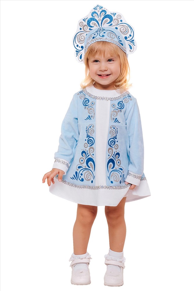 ID товара: 247470 Состав: Хлопок 100% Сезон: Весна/Лето Длина: Мини Фасон: Свободный крой Рукав: Длинный Вид застежки: Молния Крой брючин: Зауженный Рисунок: Орнамент Тип карманов: Без карманов Декоративные элементы: Вышивка Основная ткань: Хлопок Стиль: Нарядный Страна бренда: Россия Страна производства: Россия Детский новогодний костюм Снегурочки для девочек от 6 месяцев до 1,5 лет. Волшебный наряд в бело-голубом цвете представлен коротким платьем и кокошником. Особенности: Узоры и серебристая тесьма на платье Белые вставки на рукавах, вороте и подоле Хлопковая ткань Высокий узорчатый кокошник на мягкой резинке Комментарии к товару