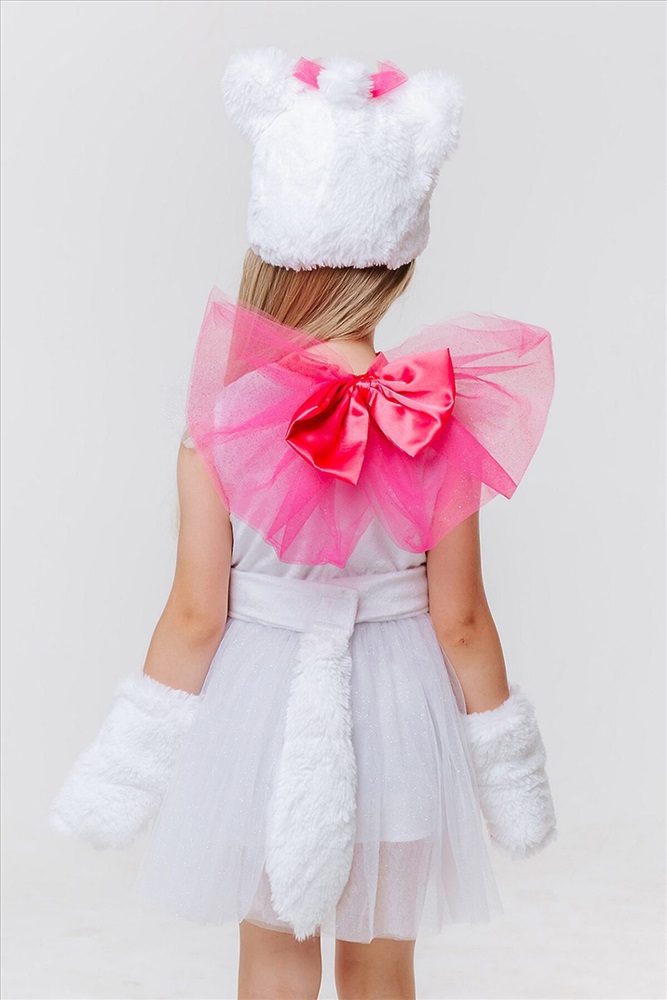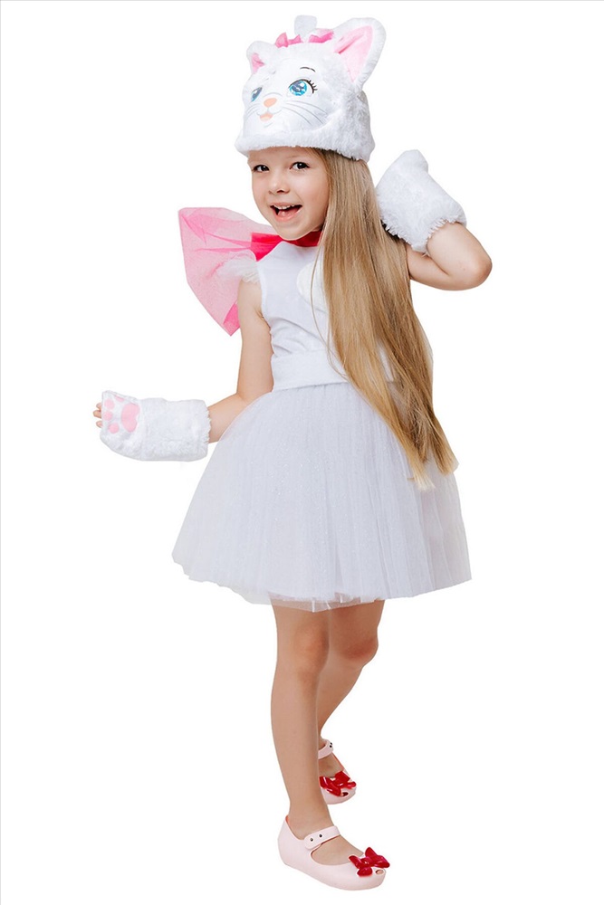 ID товара: 247488 Состав: Плюш 100% Сезон: Весна/Лето Длина: Мини Фасон: Свободный крой Рукав: Короткий Вид застежки: Бант Модель юбки/платья: Расклешенная Рисунок: нет Тип карманов: Без карманов Декоративные элементы: Пояс Стиль: Нарядный Страна бренда: Россия Страна производства: Россия Костюм Кошки Мари из мультсериала Коты аристократы для девочек. Милый белый костюм нежной кошечки понравится любой девочке. Костюм Кошка Мари сшит по лицензии с компанией Дисней. В комплект входит платье, нарукавники, маска-шапка. Особенности: Белое платье с большим розовым бантом на спине Пояс на липучке с хвостиком сзади Короткие рукава-крылышки и пышная юбка Нарукавники белые с лапками Маска-шапка с ушками, бантиком и глазками Комментарии к товару