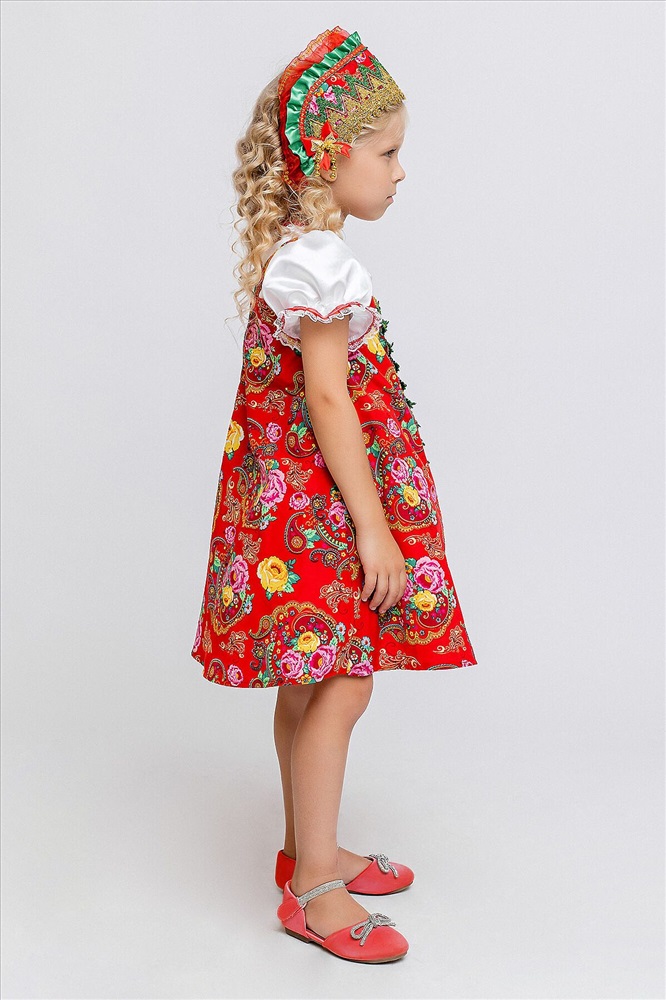 ID товара: 1035279 Сезон: Демисезон Карнавальный костюм Красна-девица детский: платье и кокошник. Девочка в таком костюме сможет почувствовать себя настоящей сказочной царевной, если она выступает на утреннике, играет в спектакле или просто идет на костюмированный праздник. Платье с короткими объемными рукавами и народным узором. Характеристики: