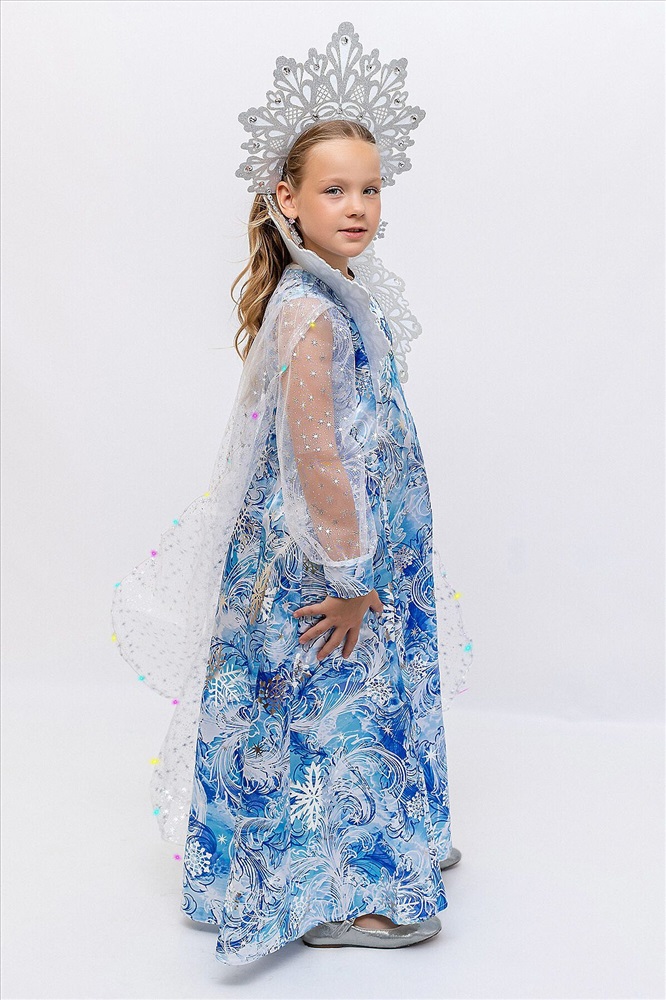 Карнавальный новогодний костюм Метелица для девочек от бренда Пуговка. В комплекте сатиновое платье с фетровым блестящим воротником, съемный плащ из сетки со светодиодами, кокошник на резинке. Это очаровательный сказочный образ, в котором можно встретить Новый год.