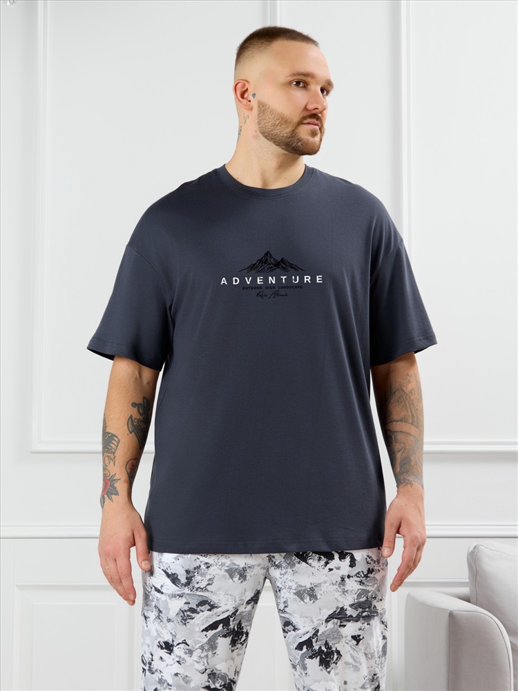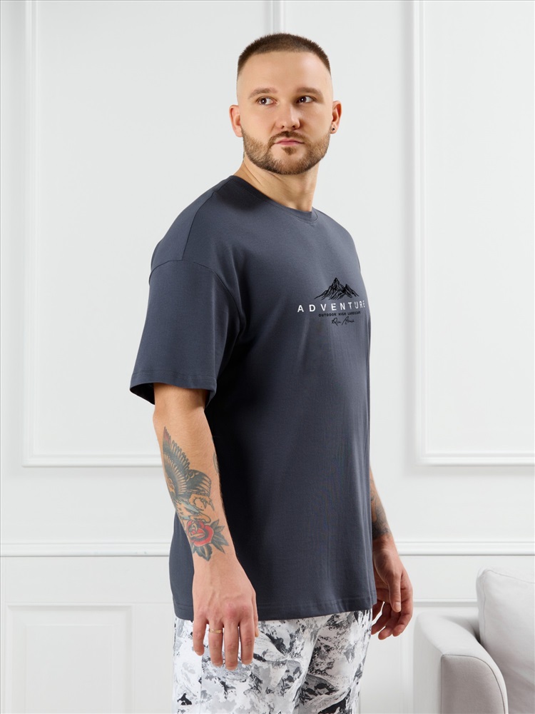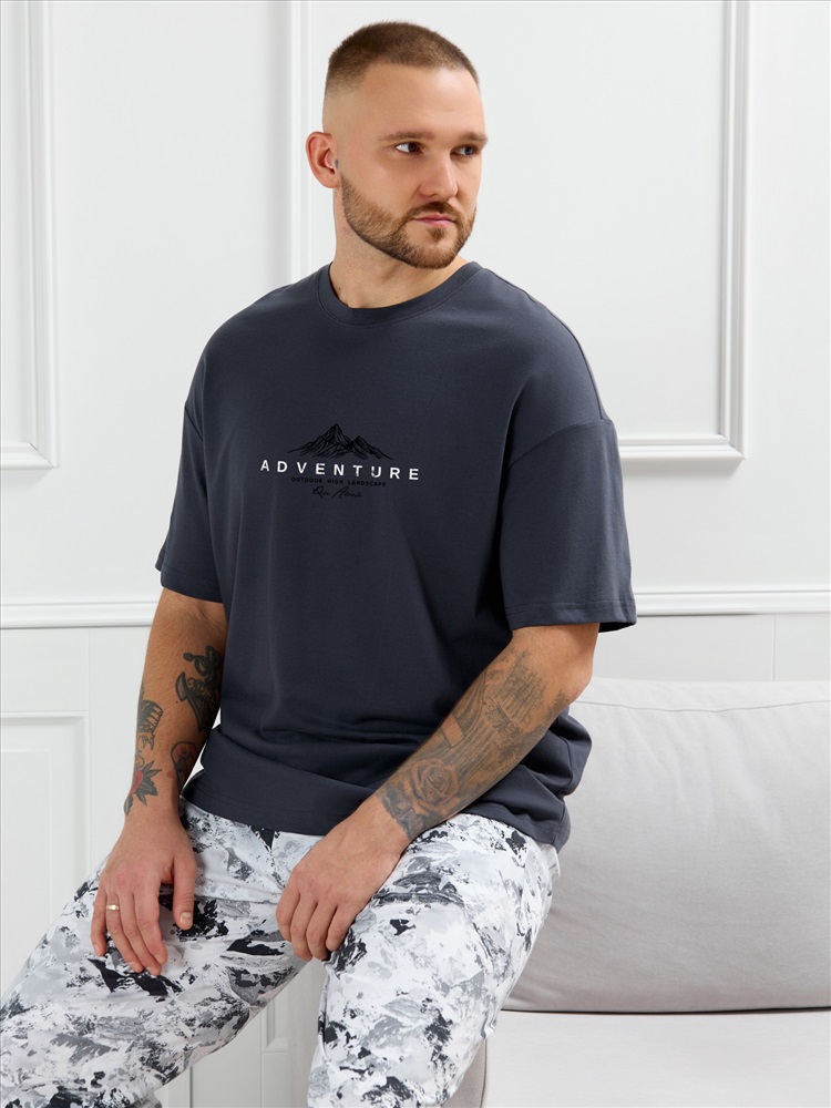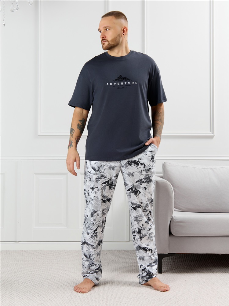 Ткань: Кулирка Кулирка - это самое гладкое и тонкое трикотажное полотно из чистого хлопка. С лицевой стороны ткань «кулирка» выглядит как «вертикальные косички», орнамент изнаночной стороны напоминает «кирпичную кладку». Свойства кулирного трикотажа- воздухопроницаемость, гигроскопичность, не теряя своей формы, практически не тянется в длину и хорошо растягивается в ширину, не образует складки. Костюм мужской, состоящий из футболки и брюк. Футболка однотонная с принтом на груди; модель свободная, со спущенной линией плеч, овальным вырезом горловины. Брюки из полотна с набивным рисунком эксклюзивного дизайна, прямые, с боковыми карманами с обтачными входами, на притачном поясе с отстроченной эластичной тесьмой.