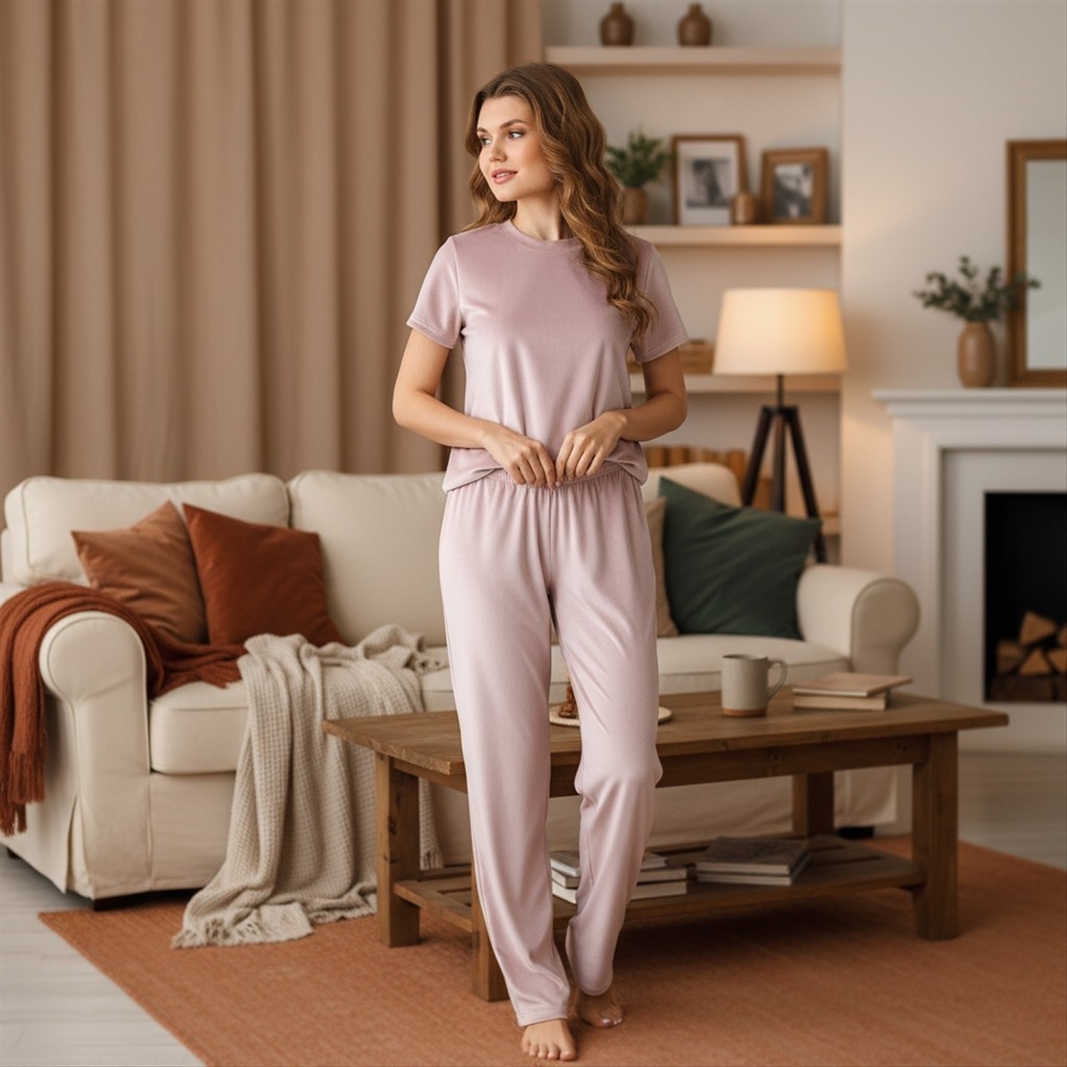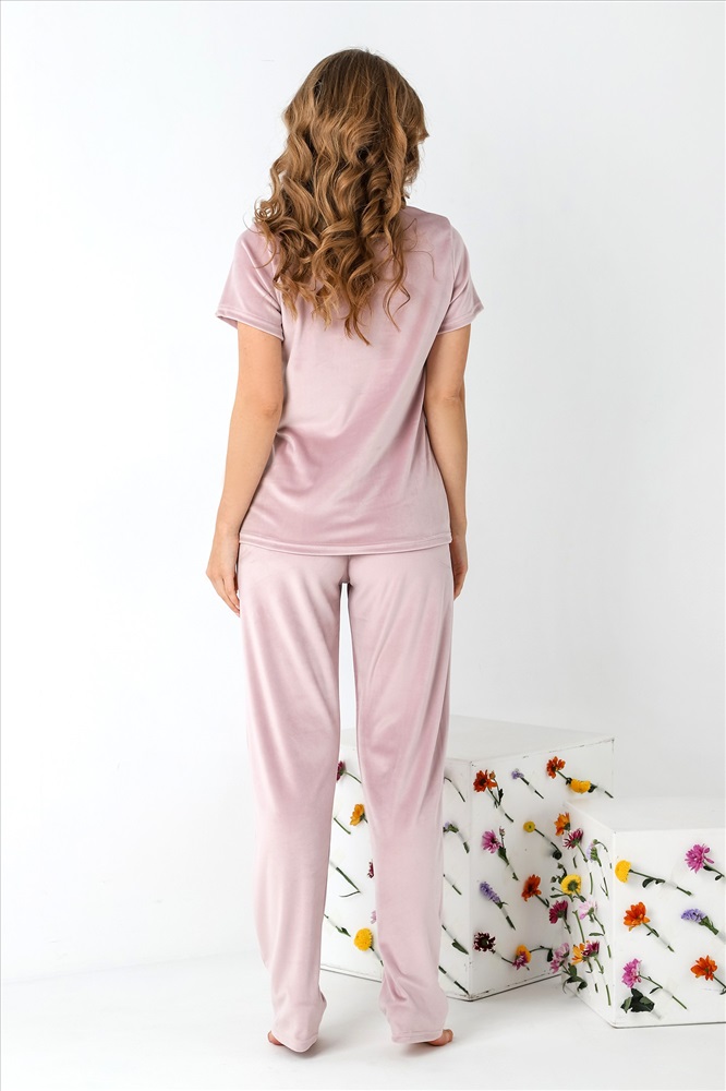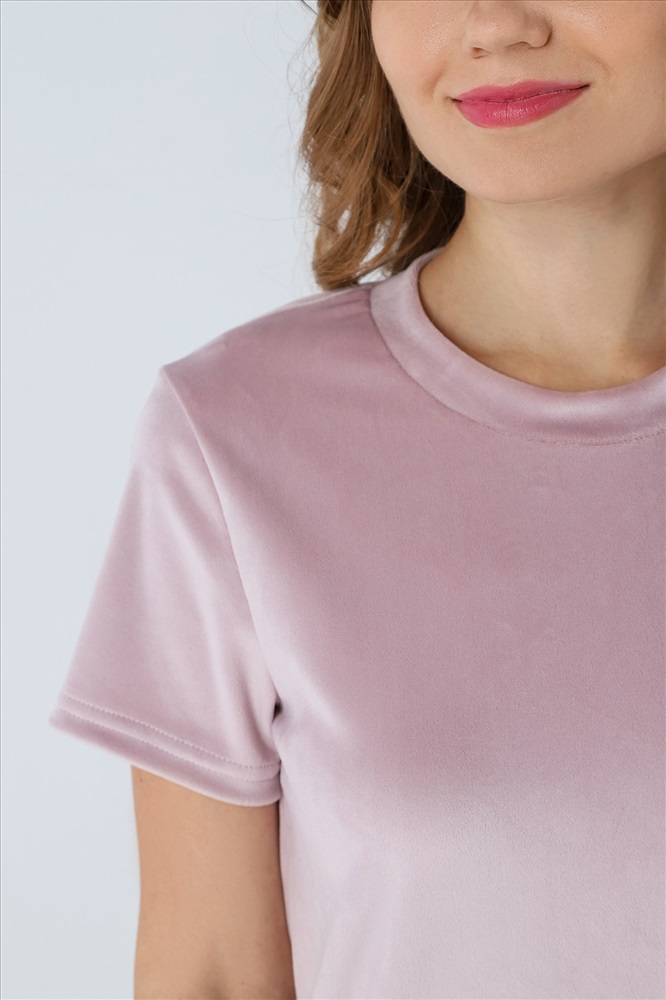 Костюм молодежный из трикотажного полотна «велюр-стрейч», состоящий из футболки и брюк. Футболка - классического покроя, с короткими втачными рукавами и горловиной овальной формы, обработанной втачной бейкой. Брюки – длинные, свободного покроя, с эластичной тесьмой по талии.