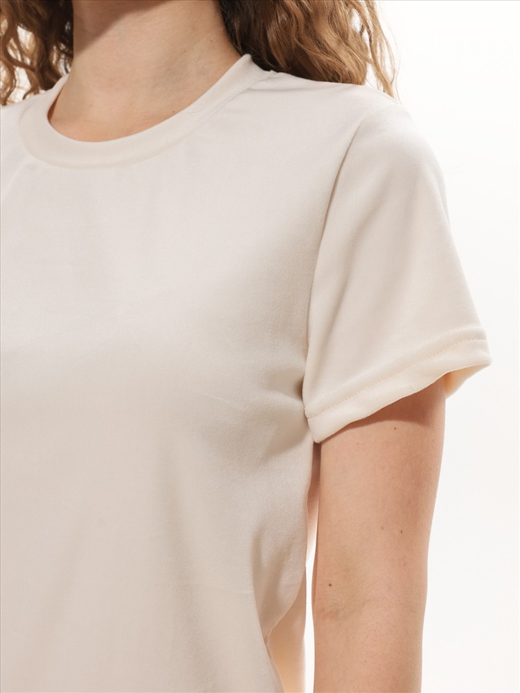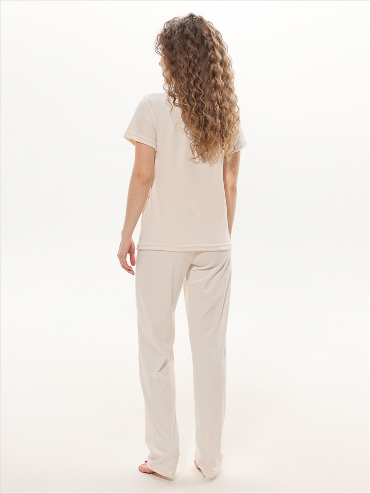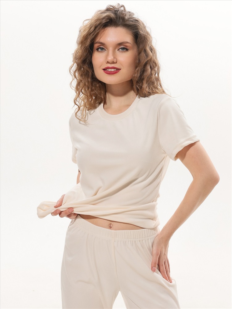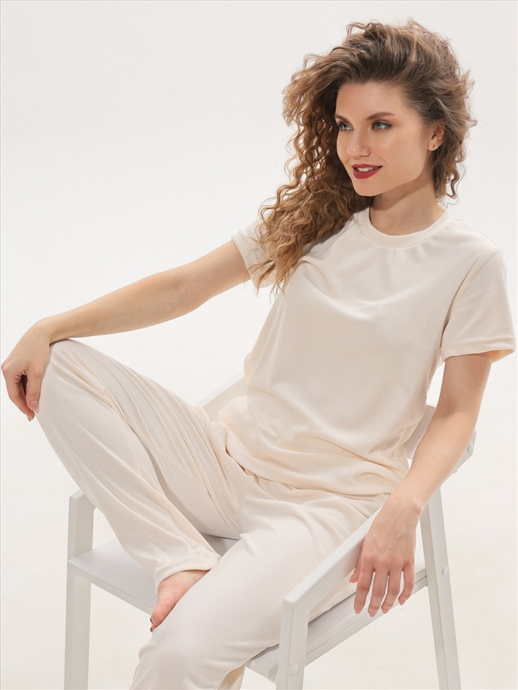 Костюм молодежный из трикотажного полотна «велюр-стрейч», состоящий из футболки и брюк. Футболка - классического покроя, с короткими втачными рукавами и горловиной овальной формы, обработанной втачной бейкой. Брюки – длинные, свободного покроя, с эластичной тесьмой по талии.