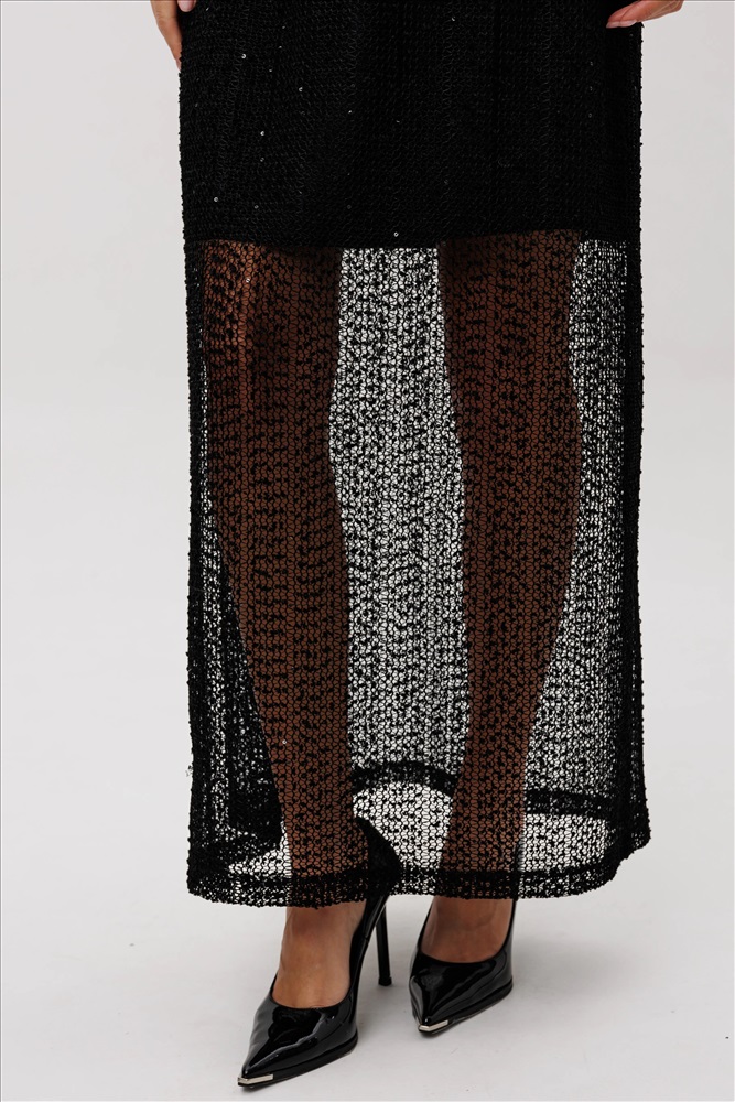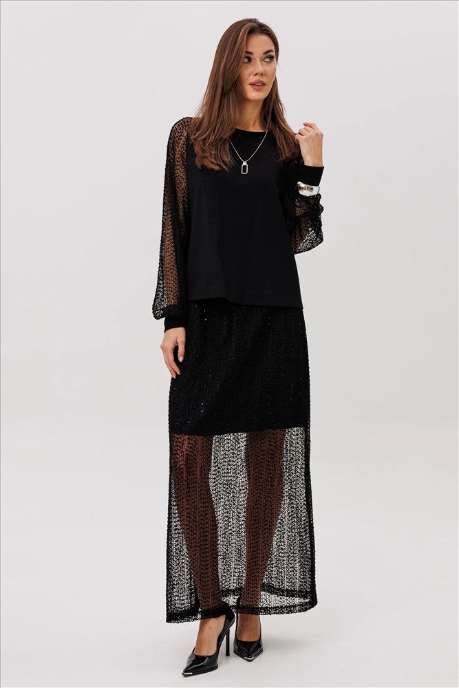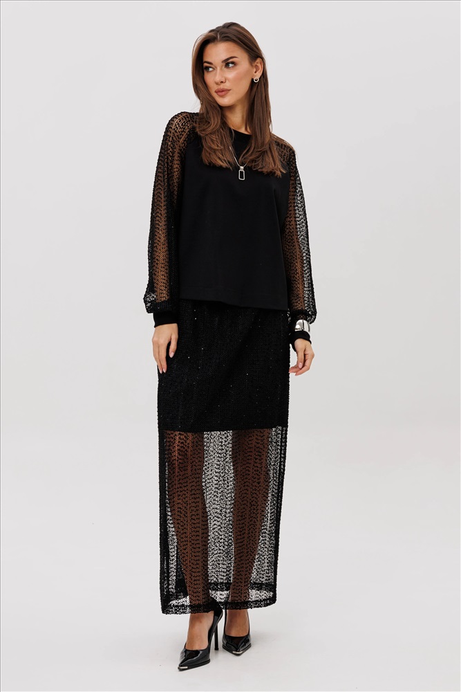 Элегантный юбочный комплект, созданный для тех, кто ценит сочетание комфорта и эффектного стиля. Верх выполнен из мягкого, комфортного вискозного полотна с нейлоном, приятного к телу и отлично удерживающего форму. Лёгкая воздушность образу придают полупрозрачные мерцающие рукава, выполненные из сетки с вкраплением микропайетки — они создают утончённую игру света при движении. Юбка макси гармонично поддерживает дизайн: плотная внутренняя часть обеспечивает комфорт и уверенность, а длинная прозрачная нижняя вставка из мерцающей сетки добавляет загадочности и женственности. Комплект смотрится нарядно, но остаётся практичным — идеален как для вечерних выходов, так и для особых событий, где хочется выглядеть эффектно, но без излишнего пафоса. Стильное сочетание фактур делает комплект настоящей находкой для создания элегантного, праздничного и современного образа.