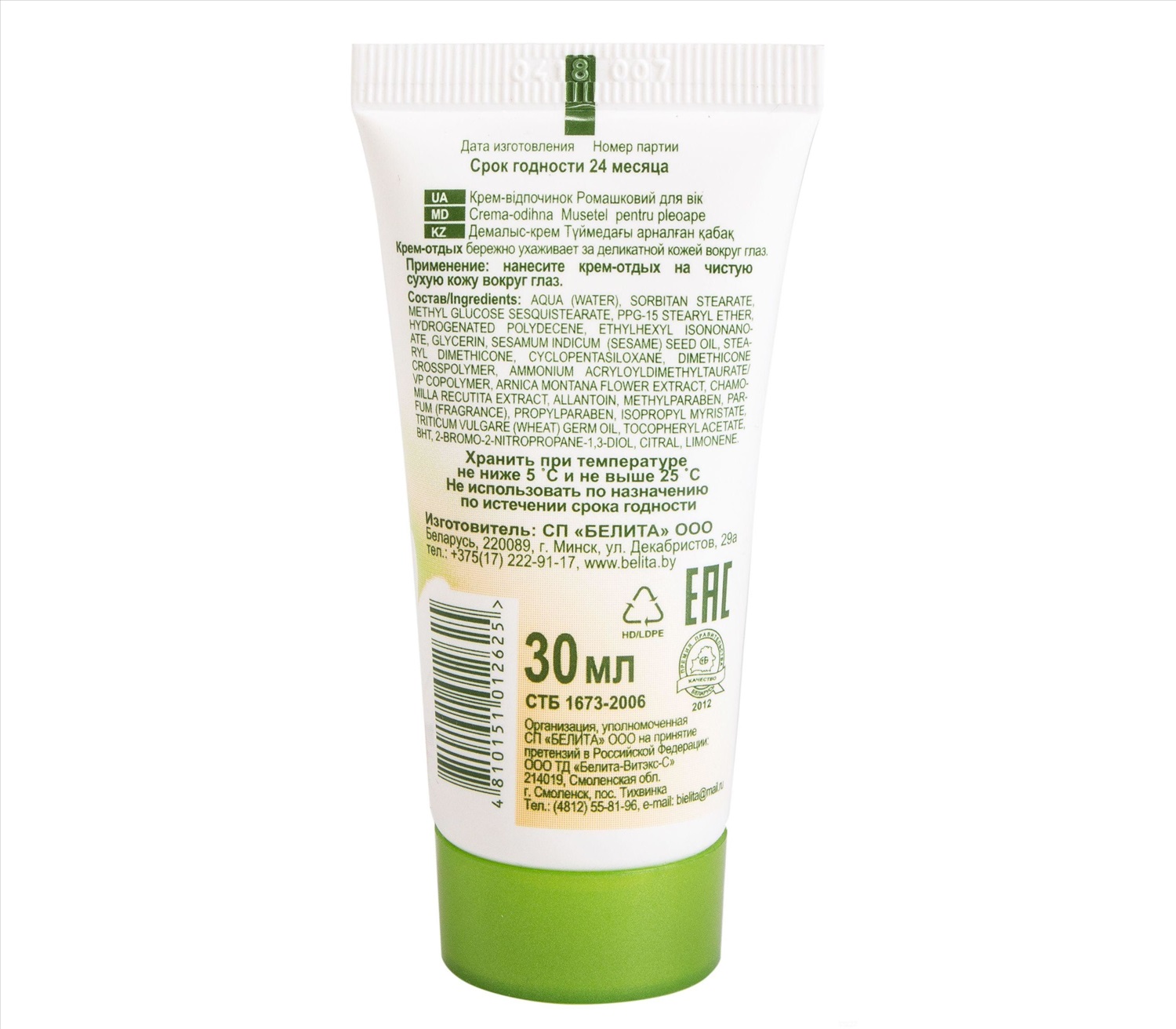 Бренд: Белита; Изготовитель: СП "Белита" ООО, Республика Беларусь, 220089, г. Минск, ул. Декабристов, 29а; Производитель: Белита; Серия: Ромашковая; Тип кожи: Для всех типов; Упаковка: Тюбик