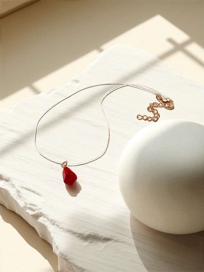 Глубокий бордовый оттенок кулона на леске создаёт выразительный акцент, который легко впишется в любой образ, добавляя ему загадочности и утончённости. Длина 33 см с дополнительными 5 см позволяет регулировать посадку, обеспечивая комфорт и универсальность ношения.
