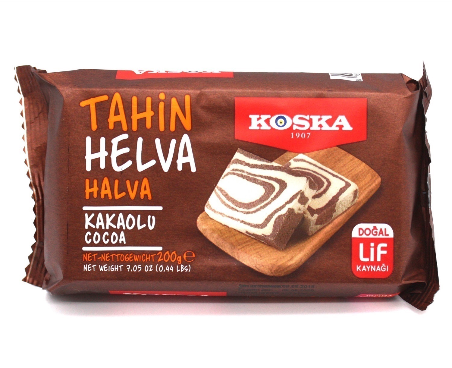 Производитель: KOSKA; Состав: Кунжутая паста (57%), сахар, какао порошок (2,5%), эмульгатор (моно и диглицериды жирных кислот), пенообразователь (мыльного корня экстракт), регулятор кислотности (лимонная кислота), ароматизатор (ванилин).; Энергетическая ценность: 543 кКал / 2273 кДж; Пищевая ценность: белки - 14,1 г, жиры - 35,6 г, углеводы - 38,8 г; Торговая марка: KOSKA; Страна: Турция; Добавки: Халва с какао; Вид: Халва классическая; Вес (г): 200