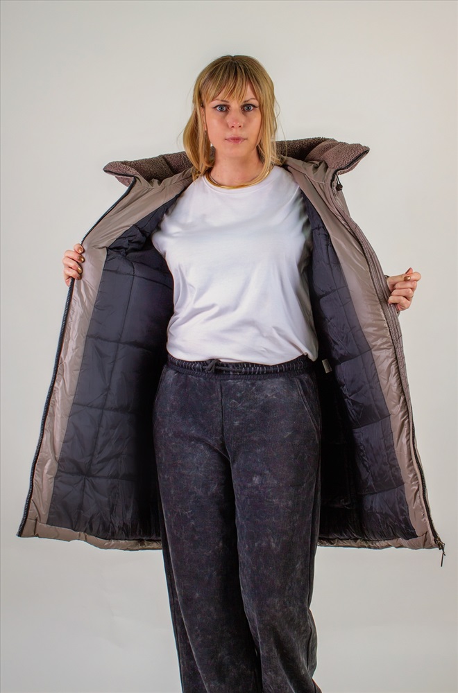 Состав: верблюжья шерсть Модель: Куртка с верблюжьей шерстью арт.219 Тип товара: куртка Материал: наполнитель "верблюжья шерсть" | курточная стеганая | курточная стеганая | наполнитель "верблюжья шерсть" Бренд: Styie Evolution Длина: средняя длина Карман: боковые | прорезные Отделка: с карманами Рисунок: однотонные Рукав: длинный рукав Сезонность: осень | весна | зима Силуэт: свободный Скидка: любая | от 10% и больше Стиль: повседневный Воротник: с капюшоном Застежка: молния Зимняя куртка удлиненная с верблюжьей шерстью арт.219 - элегантная и предельно функциональная зимняя куртка удлинённого кроя идеальный выбор для суровых морозов до 30 C, оставаясь при этом легкой. Длина изделия 92 см надежно защищает от ветра и холода поясницу и бёдра, а толстый слой наполнителя из верблюжьей шерсти обеспечивает оптимальный микроклимат, превосходно удерживая тепло и отводя излишки влаги. Объёмный капюшон с воротником-стойкой на фиксаторах комфортно регулируется по объёму и защищает не только голову, но и шею от сильного ветра. Эстетичную отделку составляют в тон изделию декоративные карманы и опушка капюшона из мелкого искусственного барашка лёгкая, гипоаллергенная и практичная альтернатива натуральному меху. Куртка застегивается на двухзамковую молнию с внутренней ветрозащитной планкой: при необходимости верхний и нижний замки позволяют регулировать свободу движений при ходьбе или за рулём. Оригинальный косой стёжок гарантирует равномерное распределение наполнителя по всему объёму изделия, исключая пробелы и холодные зоны. Для удобства в повседневной эксплуатации предусмотрены два боковых кармана на кнопках, куда легко спрятать перчатки или мелкие личные вещи, а также внутренний карман для телефона или кошелька. Манжеты из мягкого трикотажа плотно облегают запястья, не пропуская холодный воздух внутрь рукавов. Мы предлагаем эту модель в трёх актуальных цветах: тёплый коричневый, графитовый и бирюзовый. Полиэстеровая ткань с лёгкой глянцевой фактурой не впитывает влагу и легко очищается от грязи, уличной соли или шерсти домашних животных. Высококачественный пошив, прочная фурнитура и внимание к деталям делают зимнюю куртку арт.219 вашим надёжным спутником в самые лютые морозы и стильным акцентом в холодное время года. Приобретая эту модель, вы получаете сочетание комфорта, функциональности и современного дизайна, которое будет радовать вас долгие сезоны. Таблица размеров и веса