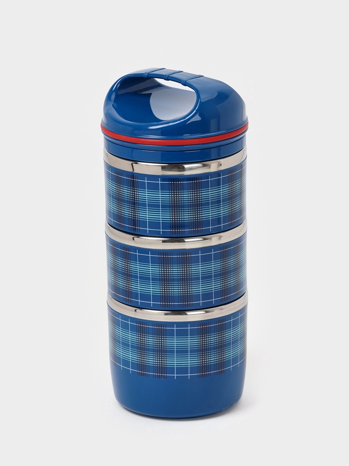 Берите обед с собой — аккуратно, стильно и без смешивания блюд! Ланч-бокс на 1,35 л — это двухуровневый контейнер с герметичной крышкой и декоративным рисунком на синем корпусе.