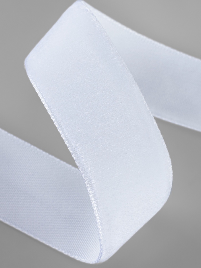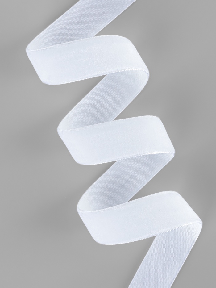 Материал — полиэстер с равномерным ворсом. Такая основа устойчива к загрязнениям, не выцветает на свету и сохраняет мягкое сияние. Белый цвет остаётся чистым, не желтеет со временем. Лента не осыпается по краям, легко режется и фиксируется клеем или нитью. Отсутствие рисунка и дополнительных эффектов делает её нейтральной — она не конкурирует с другими элементами, а подчёркивает их.