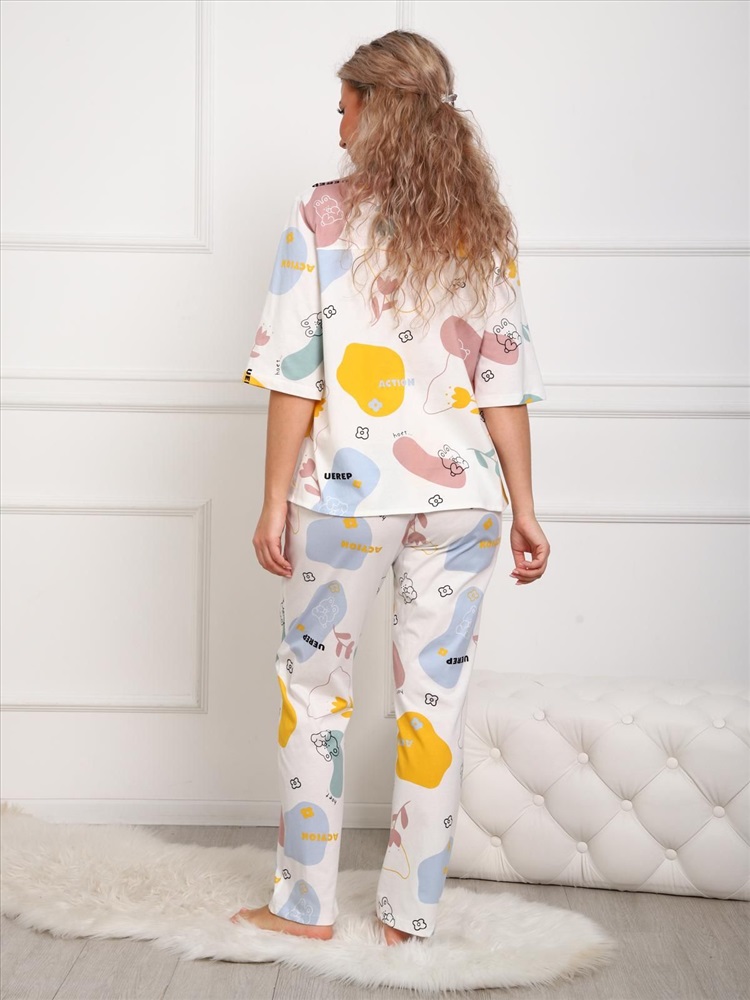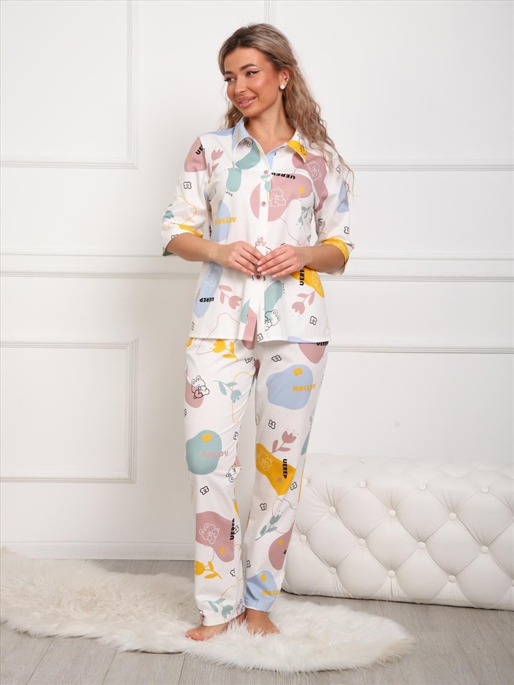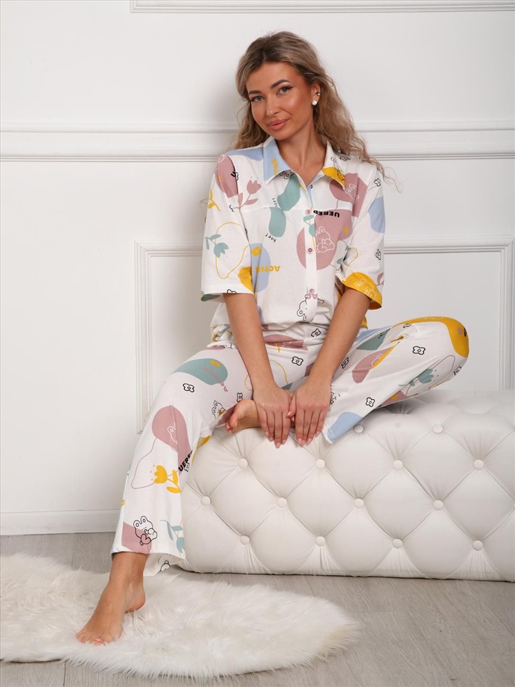 цвет: молочный Материал: Кулирка Трикотаж - Кулирка (Хлопок 100%). Пижама "Лиадан" из набивного трикотажного полотна "кулирка" состоит из рубашки и брюк. Рубашка свободного покроя с короткими втачными рукавами, отложным воротником, нагрудным карманом и центральной бортовой застежкой на петли и пуговицы. Спинка и полочка с отрезной кокеткой. Брюки длинные, свободного покроя, на притачном поясе с эластичной лентой и карманами в боковых швах. Комментарии к товару