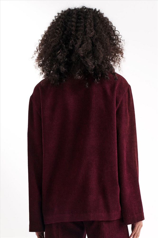 Рубашка со стояче-отложным воротником и центральной застёжкой на петли и пуговицы. Перед с накладными карманами в нижней части и имитацией кармана (отделочные строчки) в верхней. Рукава втачные.