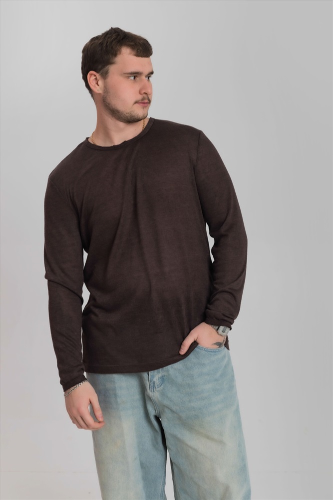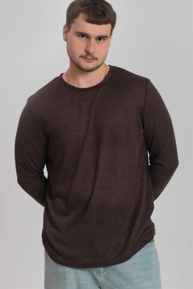 Застежка: Без застежки С капюшоном: Нет С карманами: Нет Сезон: Всесезонный Силуэт: Прямой Состав: Вискоза 65% Полиэстер 35% Цвет Номенклатуры: коричневый Лонгслив из однотонной кулирки Фламли. Горловина обработана бейкой. Низ спинки и полочки длиннее боковых сторон. Оформлен фигурно. Комментарии к товару