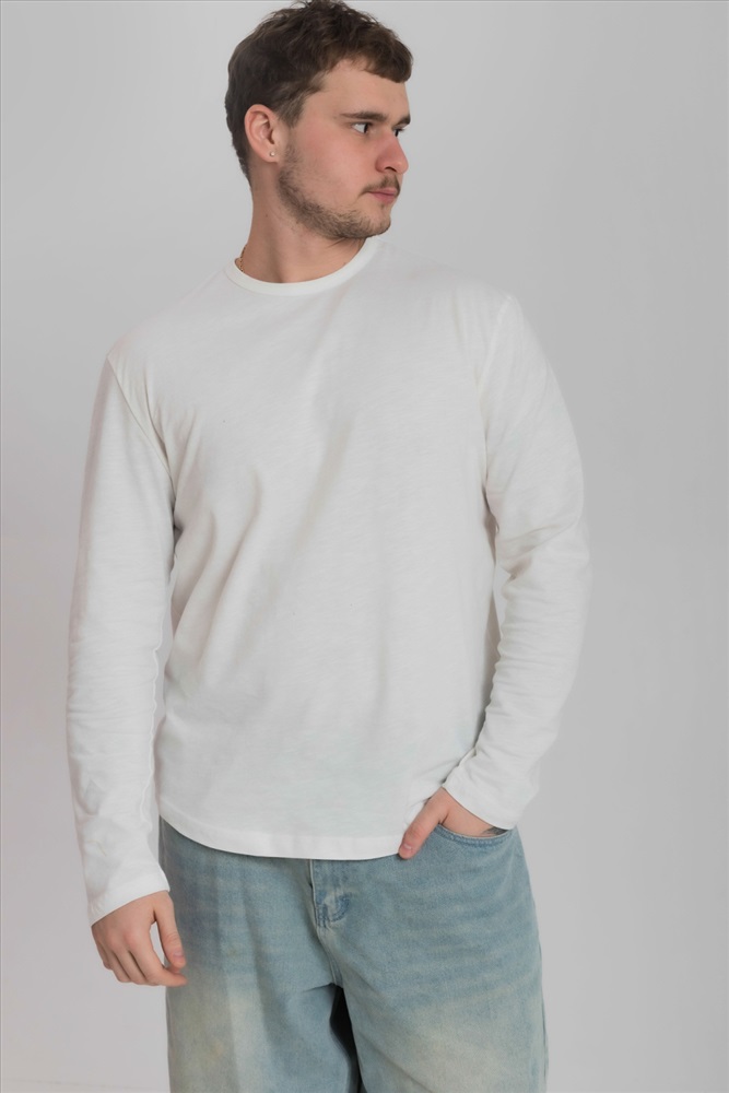 Застежка: Без застежки С капюшоном: Нет С карманами: Нет Сезон: Всесезонный Силуэт: Прямой Состав: Хлопок 100% Цвет Номенклатуры: молочный Лонгслив из однотонной кулирки Фламли. Горловина обработана бейкой. Низ спинки и полочки длиннее боковых сторон. Оформлен фигурно. Комментарии к товару