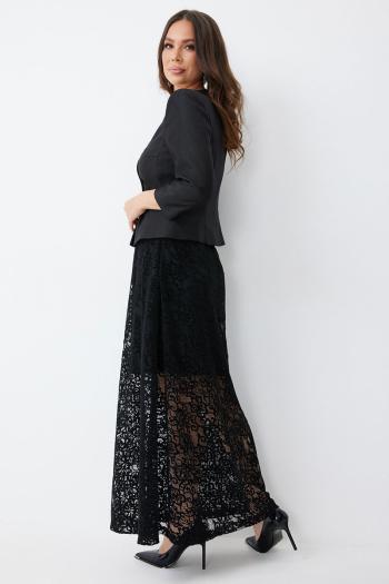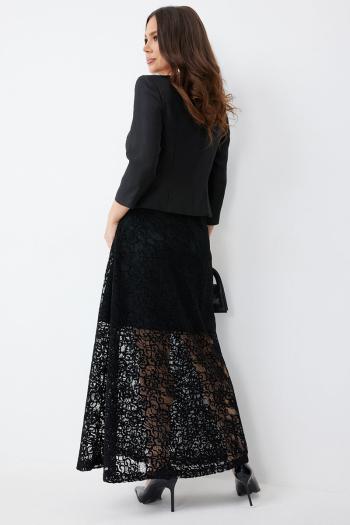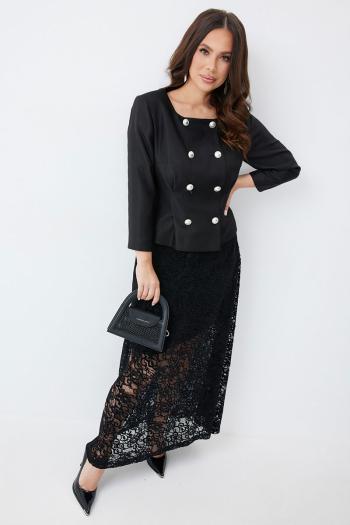 Нарядный комплект из жакета и кружевной юбки. Двубортный жакет полуприлегающего силуэта, на подкладке. Рукав длинный, втачной. Центральная застежка на красивые пришивные пуговицы. Юбка А-образного силуэта. Выполнена из красивого бархатного кружева на комфортной к телу подкладке. Юбка с притачным поясом, дополненным эластичной тесьмой. Застежка на потайную молнию и пуговицу.