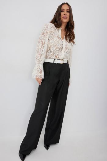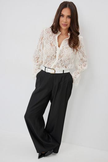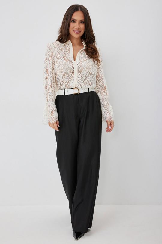 Стильный готовый образ с невероятным сочетанием кружевной блузы в нежном карамельном оттенке с шикарными брюками в красивом молочном цвете. Блуза прямого кроя с нагрудными вытачками. Рукав втачной, по низу присборен на эластичную тесьму и дополнен притачной кружевной манжетой. Застежка центральная на пришивные пуговицы. Воротник отложной на стойке. Блуза выполнена из красивого нежного бархатного кружева премиум качества. Брюки классического прямого кроя. Посадка средняя. Пояс притачной, дополнен эластичной тесьмой. Брюки дополнены удобными боковыми и задними карманами. Застежка гульфик на молнию и пуговицу. Выполнены из красивой гладкой костюмной ткани с жемчужным отливом. Красивый пояс в комплекте.