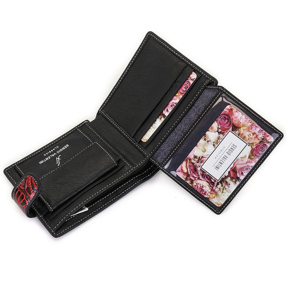 Женское кожаное портмоне от Sergio Valentini. Закрывается на хлястик с кнопкой. Внутри три отделения для купюр (одно на молнии), семь кармашков для пластиковых карт, два прозрачных окошка на клапане, два боковых кармана и отделение для монет, закрывающееся на клапан с кнопкой.