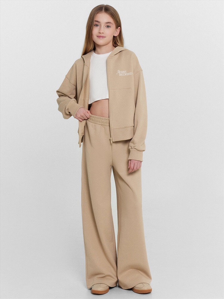 Декоративные элементы: без элементов Брюки для девочек свободного силуэта. Пояс отрезной из основного полотна с эластичной тесьмой внутри 50RV. По поясу проложены отделочные строчки. Низ брюк обработан швом в подгибку.