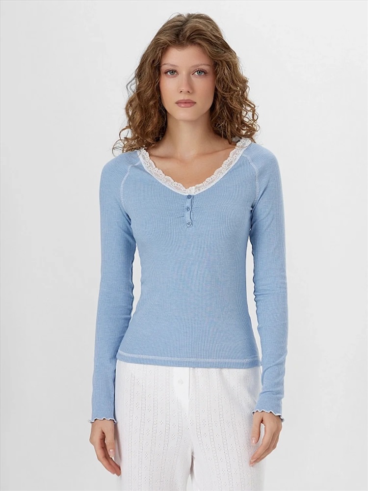 Главная особенность - нежное кружево, украшающее линию декольте, что добавляет образу элегантную нотку соблазнительности. Круглый вырез горловины с контрастной строчкой подчеркивает эту красивую деталь.