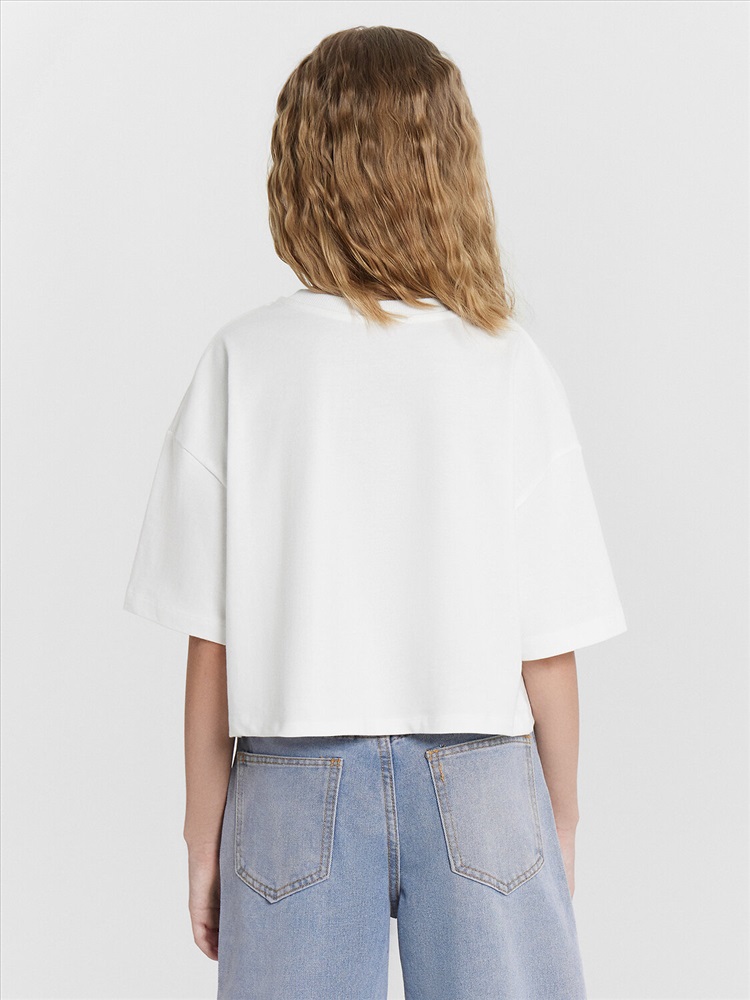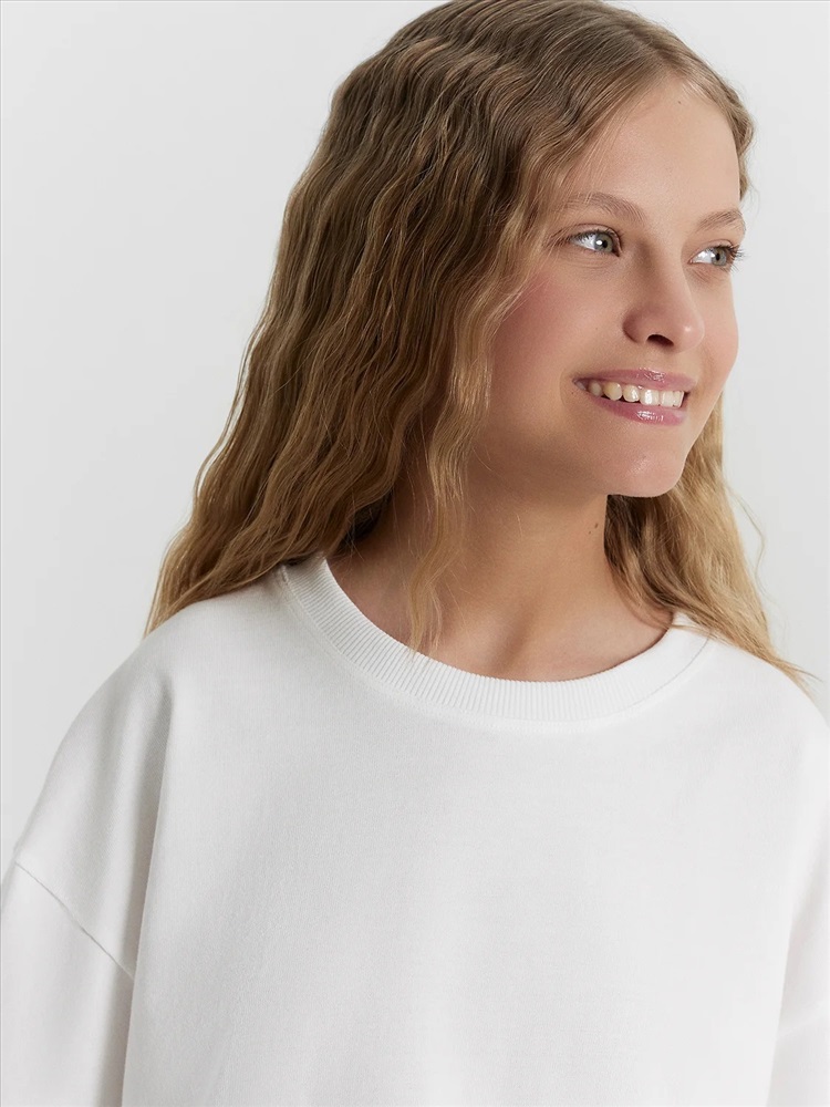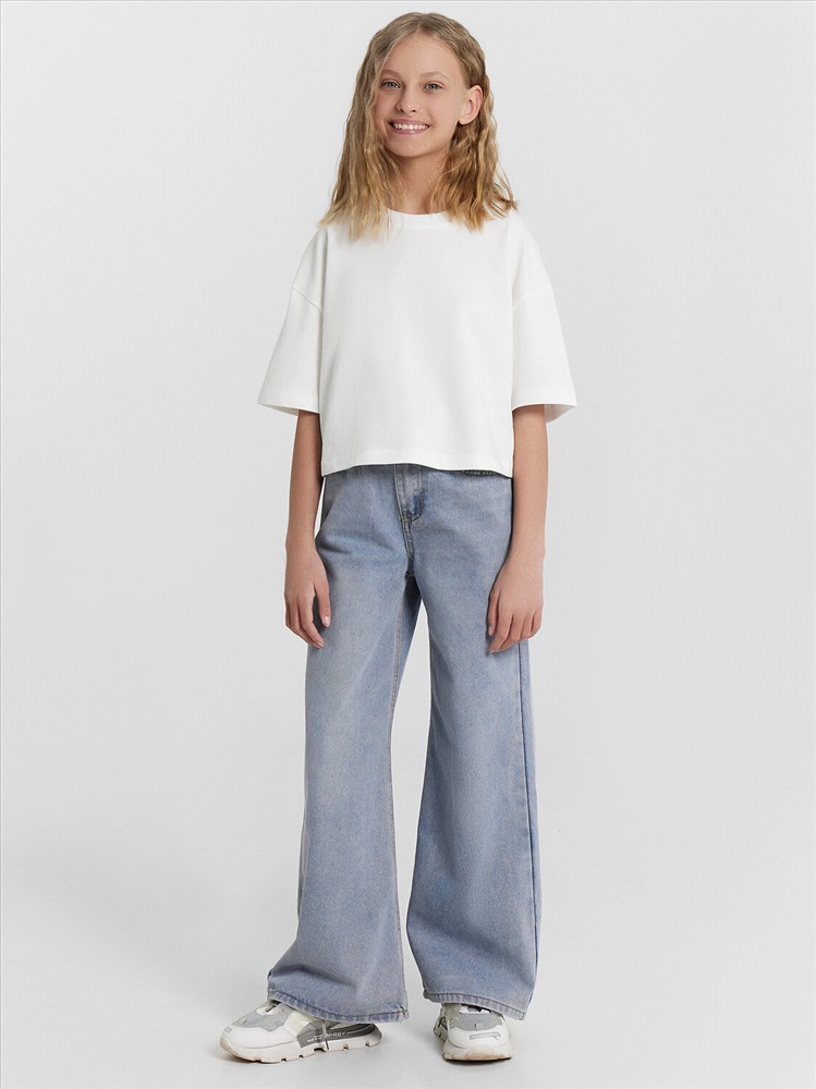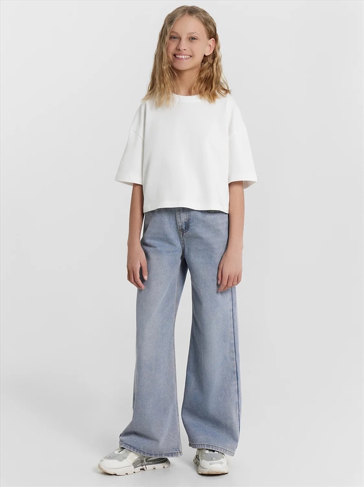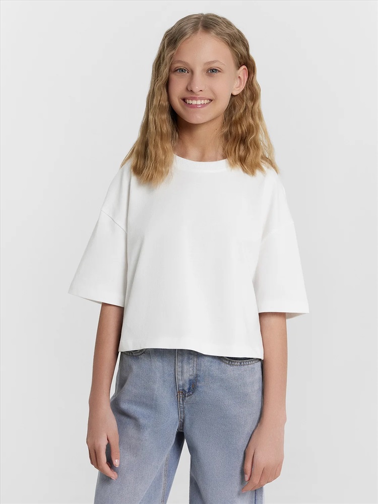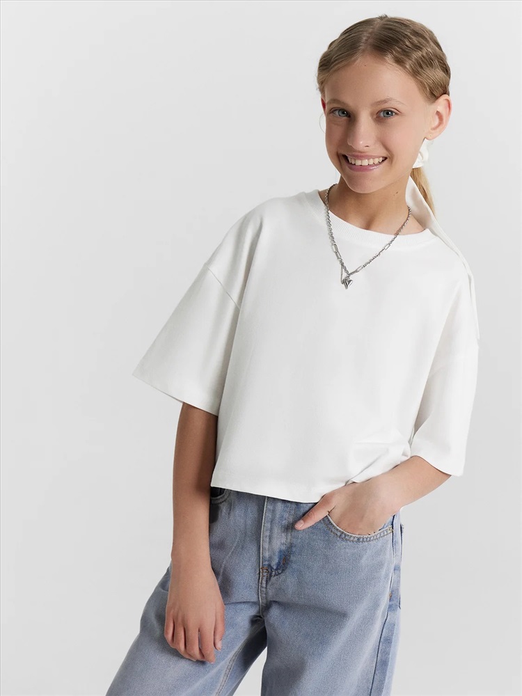 Пол: Девочки Футболка прямого силуэта укороченная. Перед и спинка цельнокроенные. Рукав втачной, короткий. Горловина круглой формы. Окантована обтачкой из рибаны. Шов втачивания обтачки по спинке закрыт бейкой из основного полотна. Низ рукавов и футболки швом в подгибку.