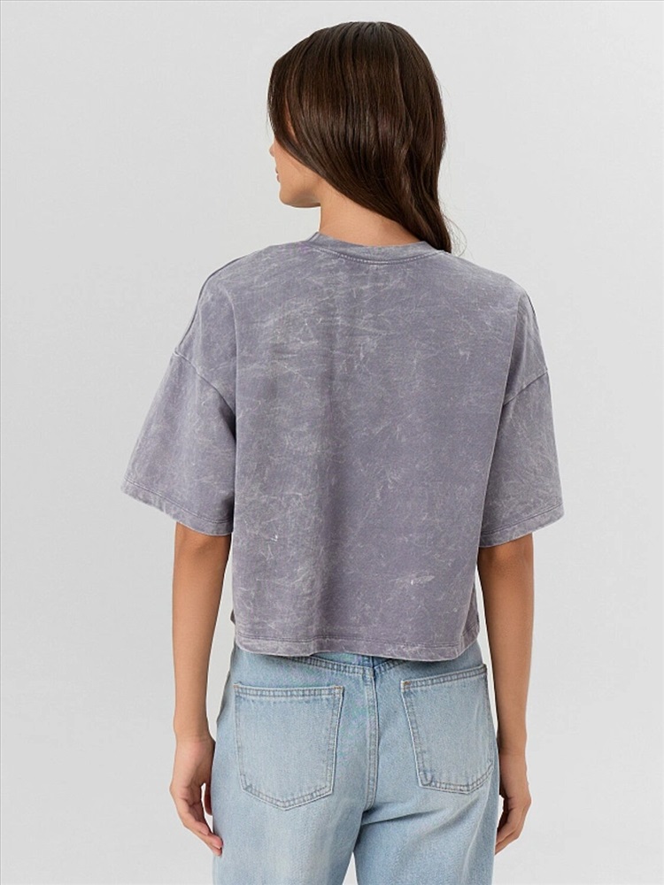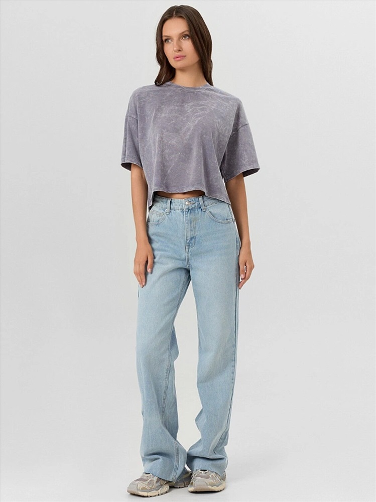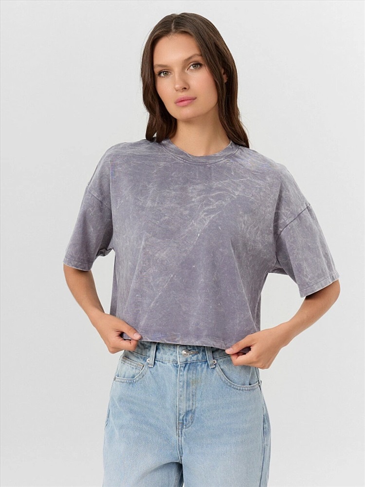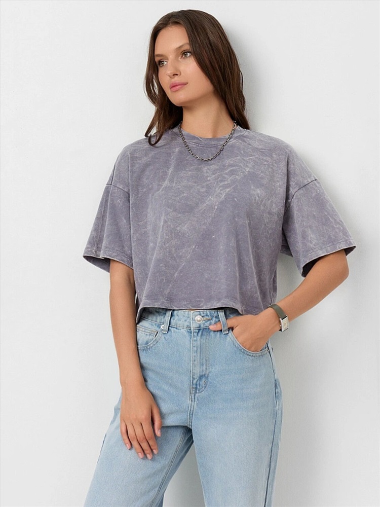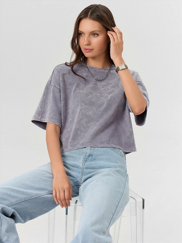 Рост: 164-170 Укороченная хлопковая футболка из полотна кулирка. Силуэт свободный, оверсайз. Горловина круглой формы. Плечо спущено, пройма углублена – это делает движения максимально комфортными. Рукава длиной до локтя или чуть выше. Стильная модель!