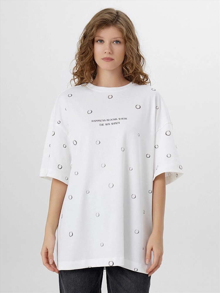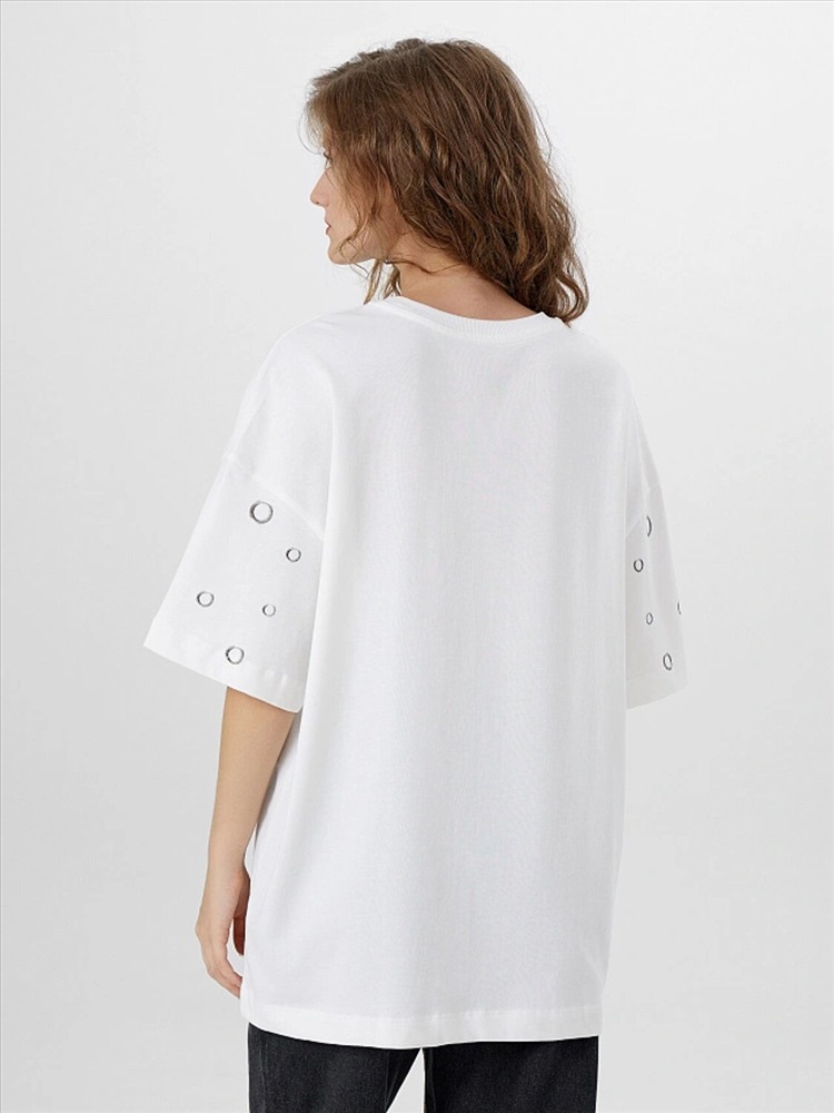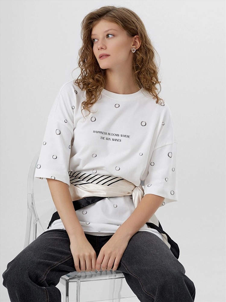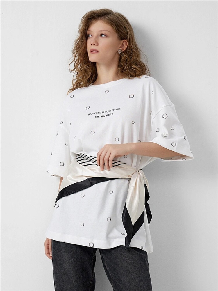 Такая футболка легко сочетается с джинсами для повседневного образа, с юбками для более женственных луков или с велосипедками для спортивного стиля. Практичный и стильный вариант, который подчеркнет вашу индивидуальность и подарит ощущение легкости в течение всего дня.