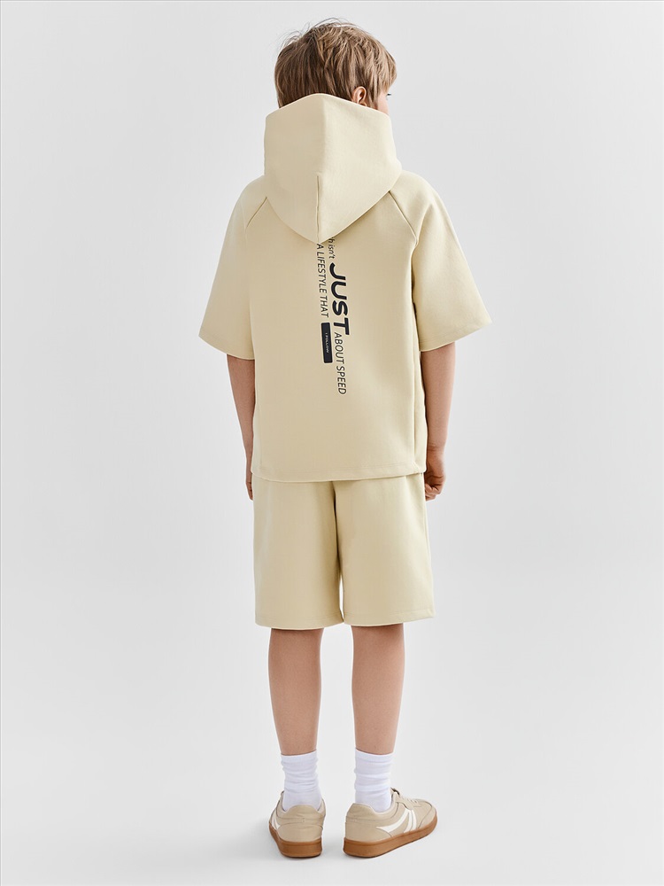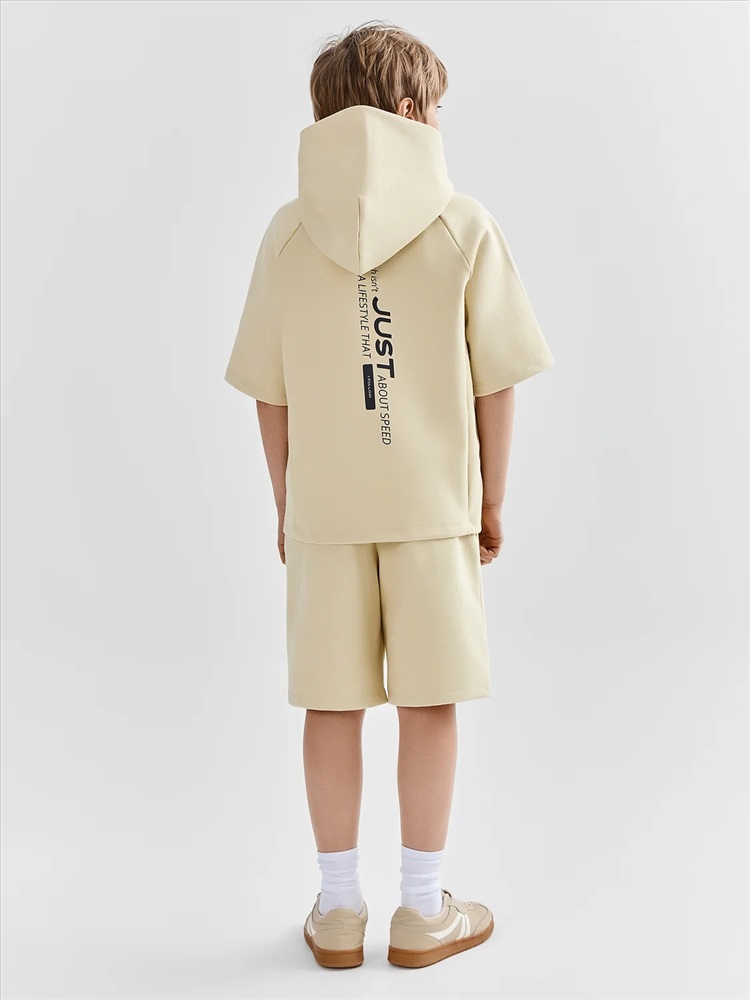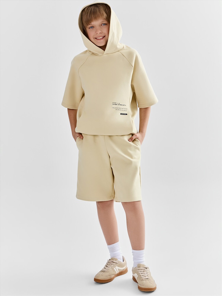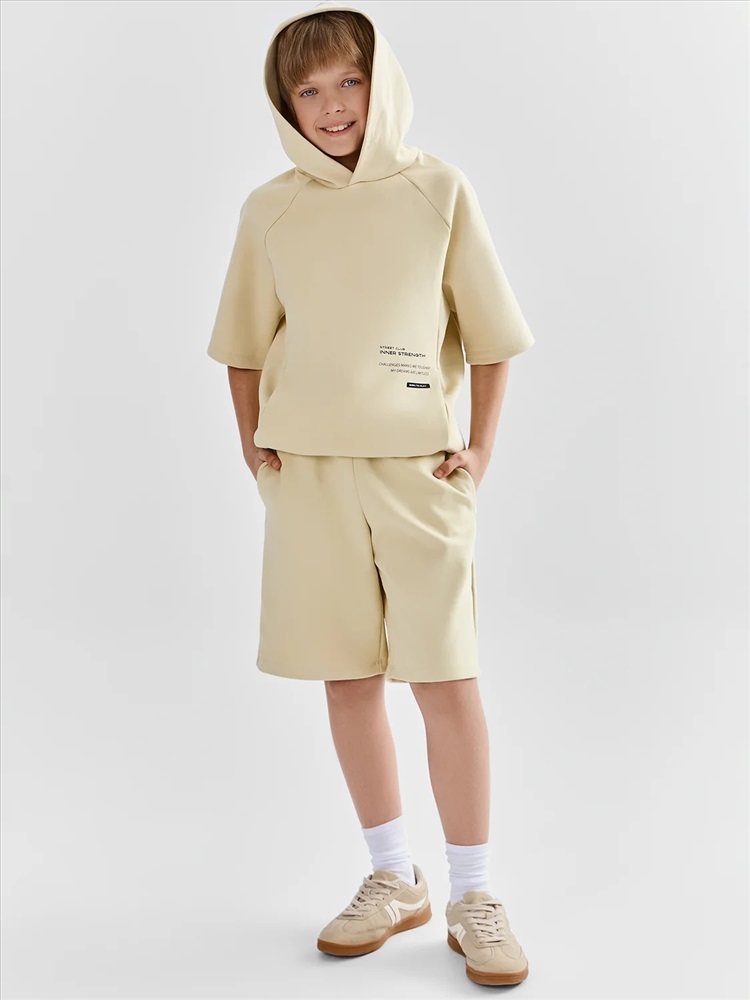 Российский размер: 116 Рост: 110-116 Возраст: 6 Обхват груди: 60 Обхват талии: 54 Артикул поставщика: 393348 Состав: 85% хлопок; 15% полиэстер Год: 2026 Страна: Беларусь Тип карманов: в шве Модель шорт: классические Длина изделия: 7/8 Пол: Мальчики Покрой/ Силуэт: оверсайз Уход за вещами: деликатная стирка при 30 градусах Размер: 110-56 Опции капюшона: с капюшоном Конструктивные элементы: нет Назначение: повседневная Вырез горловины: круглый Предмет: Комплект фактура материала: интерлок Утеплитель: без утепления Тип рукава: с коротким рукавом реглан Декоративные элементы: без элементов Вид застежки: без застежки Комплект состоит из худи и шорт Худи оверсайз с капюшоном.. Рукава короткий, реглан. Горловина круглой формы. Шов притачивания закрыт х/б тесьмой . Боковые швы перенесены вперед. В боковых швах - карманы. Низ изделия и рукавов в подгибку. Шорты выше колена, свободного силуэта с средней посадкой. С карманами в боковых швах. Пояс отрезной внутри с резиной 40RV, с внутренней стороны пробиты петли и протянут шнур 10PXС-1. Низ шорт в подгибку Комментарии к товару