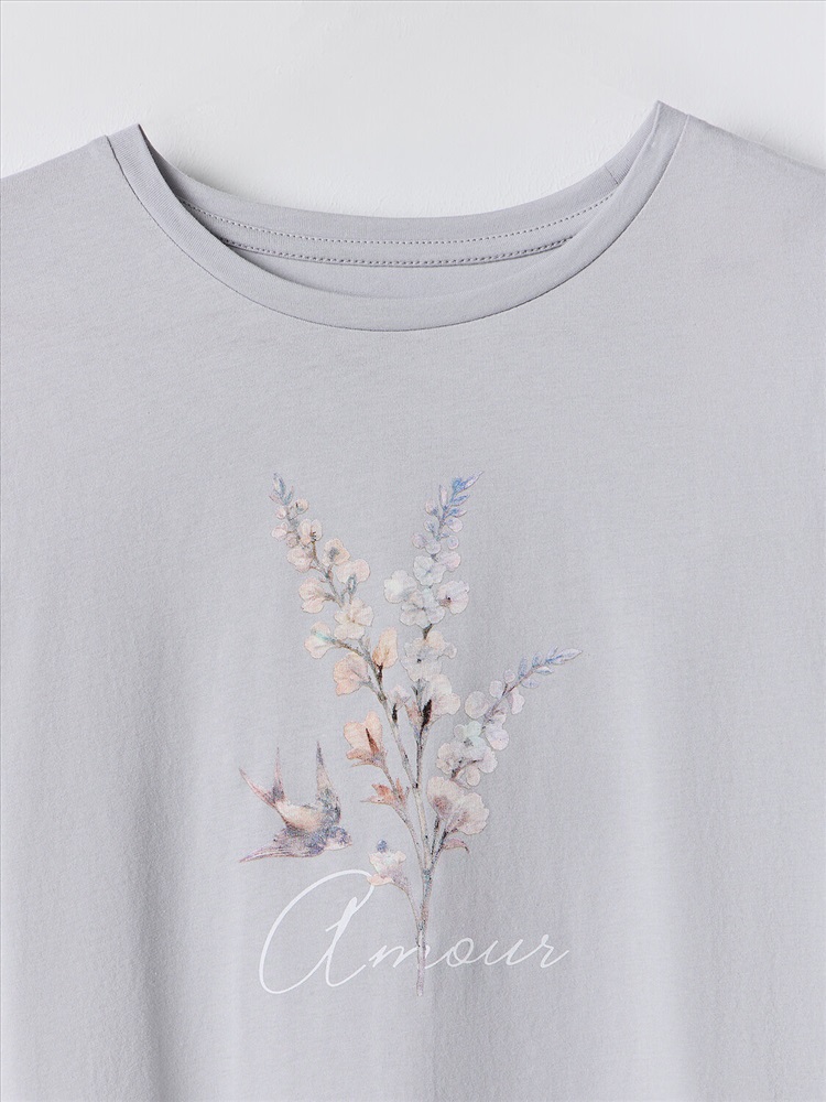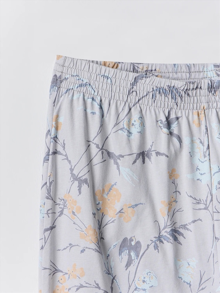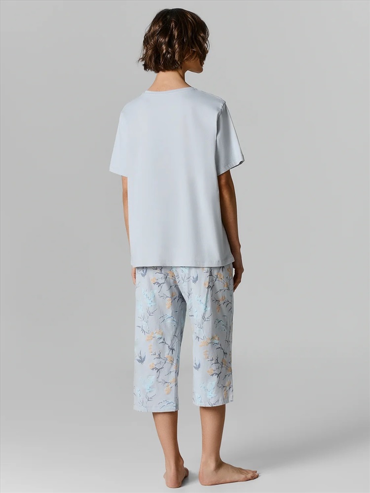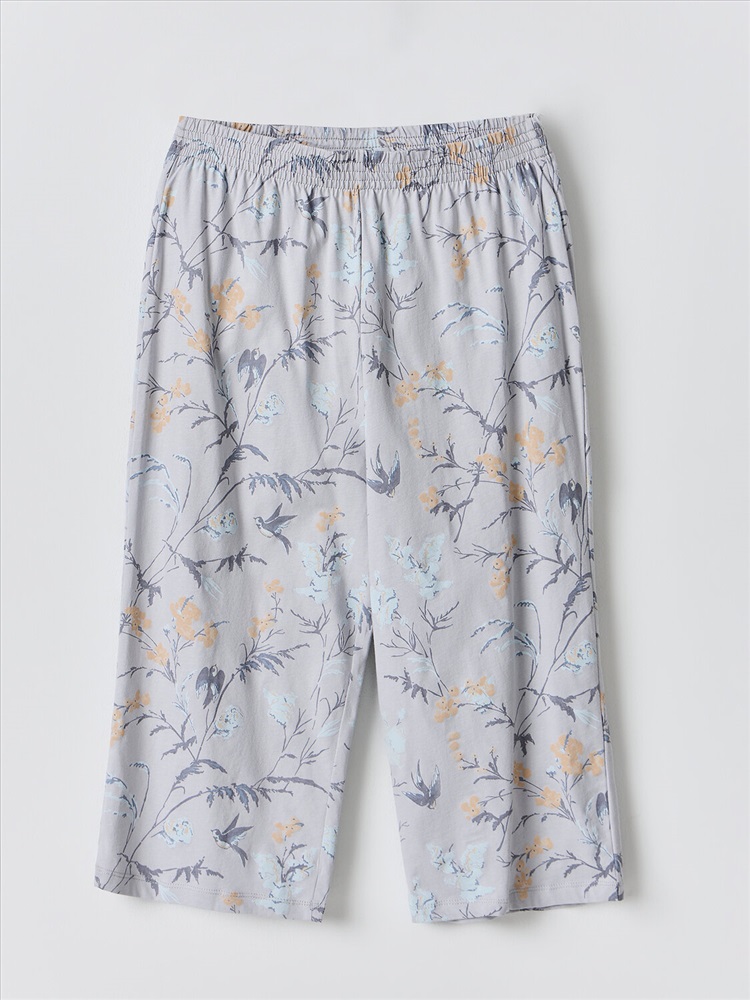 Обхват бедер: 102 Футболка свободного силуэта, перед и спинка цельнокроенные. Горловина обработана бейкой из основного полотна. Рукав втачной, короткий, одношовный. Низ изделия обработан швом в подгибку. Бриджи свободного силуэта, длиной до середины икры. Пояс цельнокроенный с эластичной тесьмой внутри 40RV. Низ изделия обработан швом в подгибку.