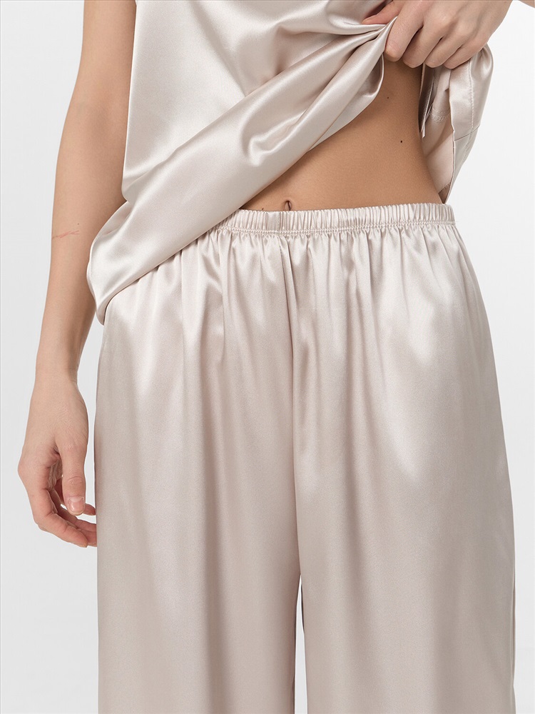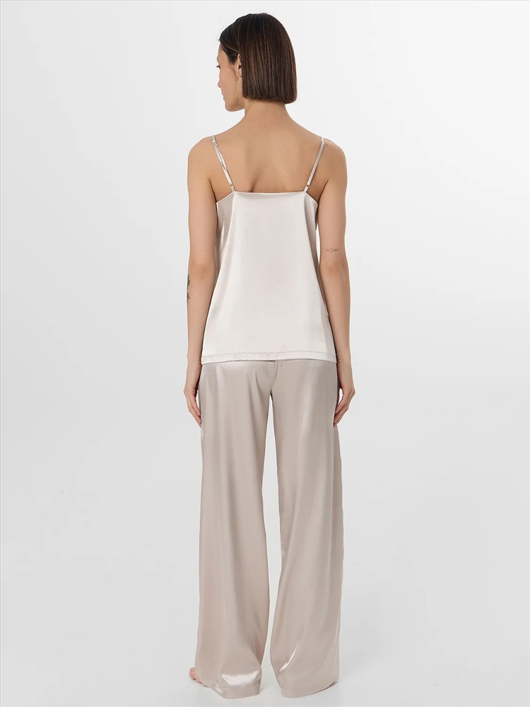 Рост: 170 Комплект женский состоит из блузы и брюк. Блуза прямого силуэта удлиненная, на тонких бретелях. Горловина V-образной формы. Бретели выполнены из основного полотна с регулировкой на регуляторы и кольца (пластик 6мм). Горловина и проймы обработаны обтачкой. На передней детали застрочены вытачки. Нижний срез обработан швом вподгибку с закрытым срезом. Брюки прямые свободные, посадка средняя. Пояс цельнокроеный с эластичной тесьмой внутри (внутр. 20мм 20RV). Брюки с боковыми швами. Нижний срез обработан швом вподгибку с закрытым срезом.