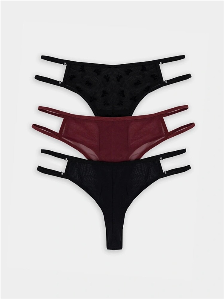 Модель трусов: бразилиана Этот набор трусов бразилиана включает три пары изысканного нижнего белья, созданного для современных женщин. Трусы женские модели бразилиана выполнены из ультралегкого сетчатого материала, который сочетает нежную полупрозрачность с повседневным удобством.