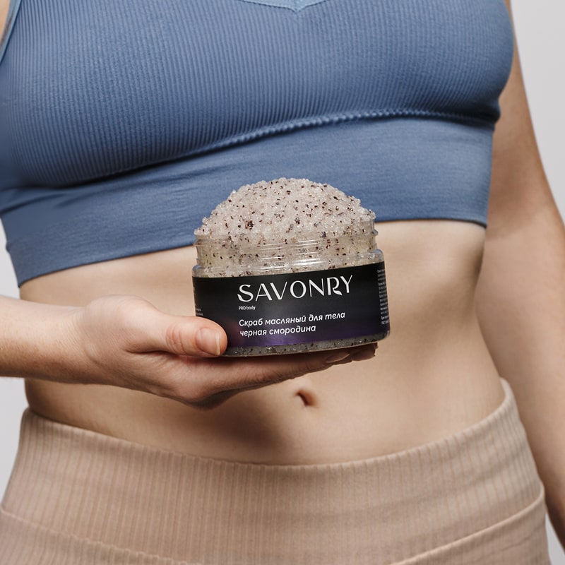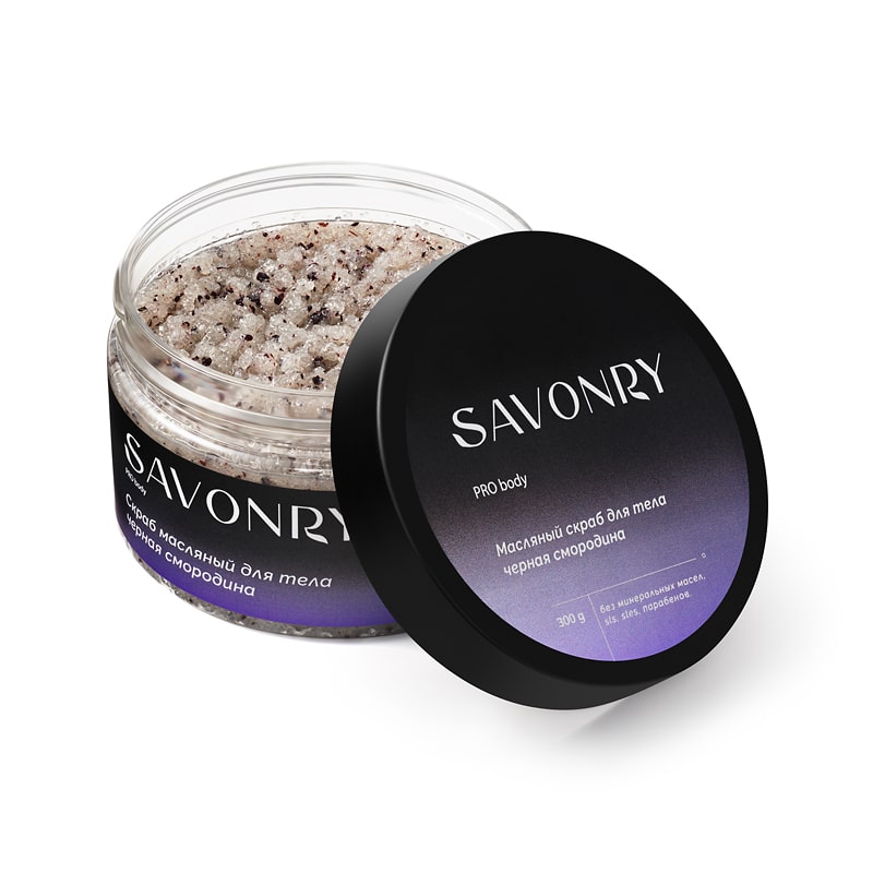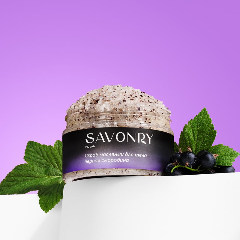 Скраб обогащен экстрактом плодов черной смородины, который восстанавливает защитный барьер кожи, прекрасно увлажняет, разглаживает и тонизирует, богат витамином С, что обеспечивает хороший омолаживающий эффект. Также экстракт смородины обладает отбеливающим действием.