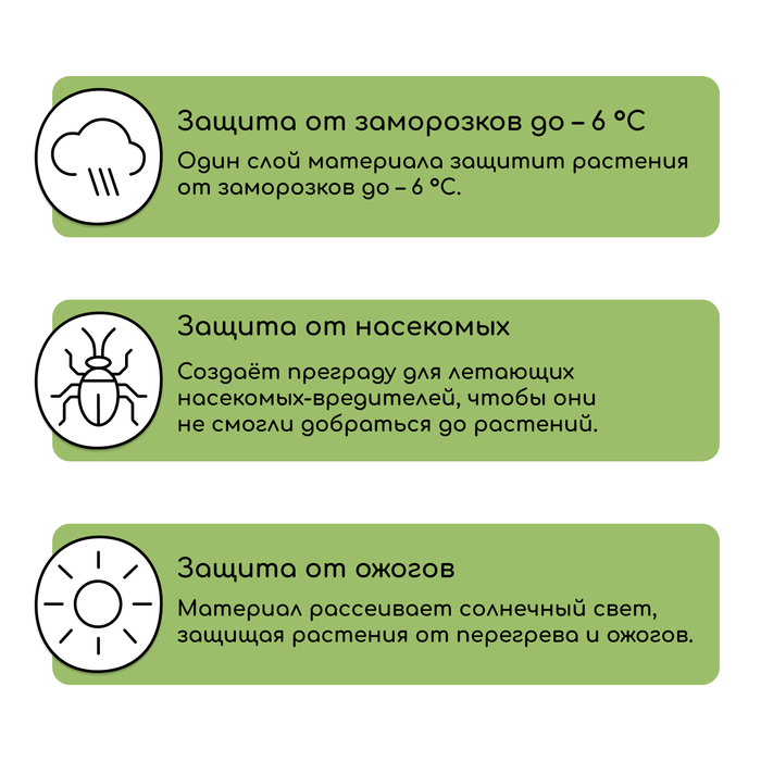 Защищает от заморозков, ожогов, перепадов температуры, осадков и насекомых.