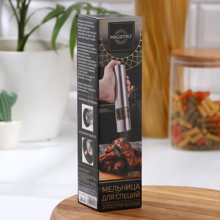 Производитель: Magistro; Габариты: 24 x 6 x 6; Страна: Китай; В боксе: 50 шт; Состав: Акрил, керамика, нержавеющая сталь; Материалы: акрил, керамика, нержавеющая сталь; Фасовка: по 1 шт; Индивидуальная упаковка: Цветная картонная коробка; Габариты товара: 6 см × 6 см × 23 см; Сертификат: ЕАС; Набор: Нет; Цвет: Хромированный; Количество батареек: 4; Материал корпуса: Нержавеющая сталь; Рисунок: Нет; Тематика праздника: Универсальная тематика; Материал: Нержавеющая сталь; Типоразмер батареек: AA (LR6); Материал рабочей части: Керамика; Беспроводное использование: Да