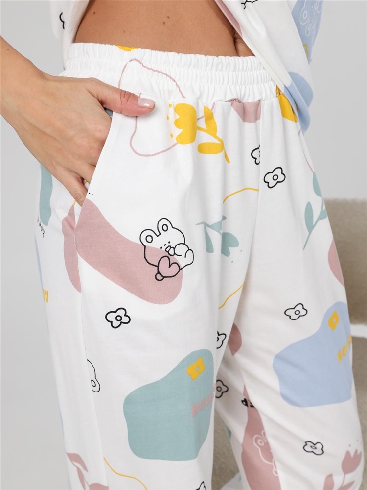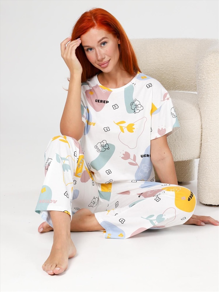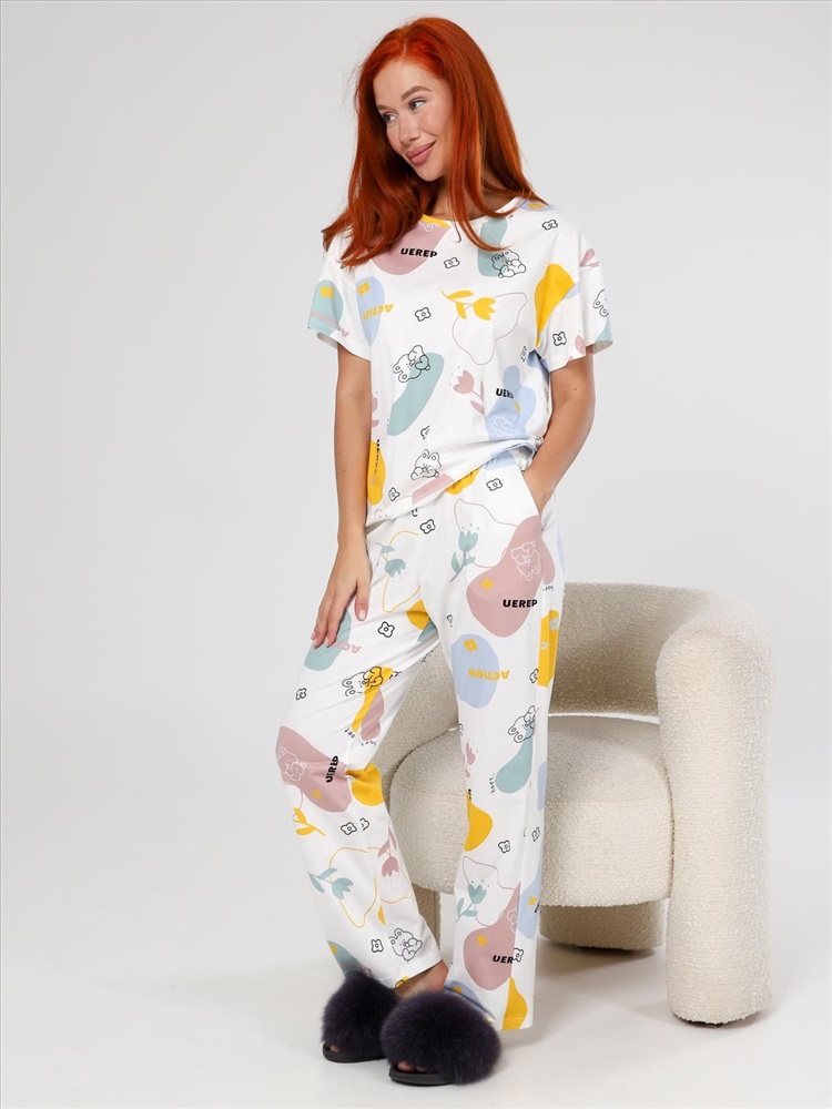 цвет: молочный Материал: Кулирка Трикотаж - Кулирка (Хлопок 100%). Пижама "Мирин" из набивного трикотажного полотна "кулирка" состоит из футболки и брюк. Футболка свободного покроя со спущенной линией плеча, короткими втачными рукавами, горловиной овальной формы, обработанной втачной планкой. Брюки длинные, свободного покроя, на притачном поясе с эластичной лентой и карманами в боковых швах. Комментарии к товару