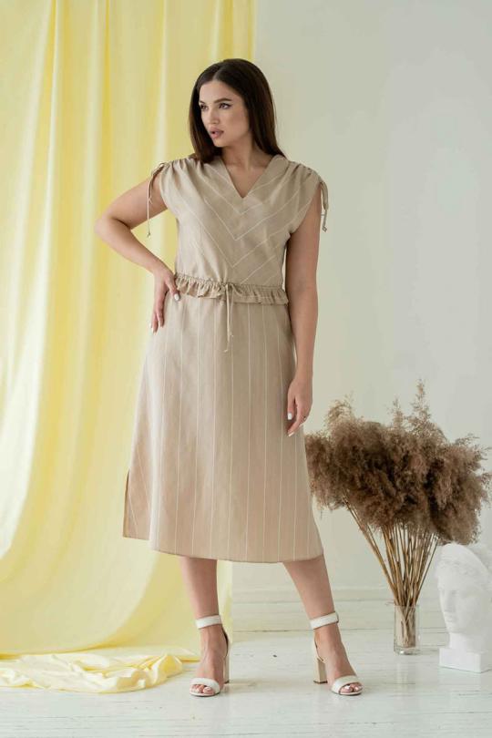 Платье женское свободного силуэта выполнено из плательной летней ткани. Плечи спущены и собираются на кулису. По линии талии кулиса и притачной волан. В боковых швах карманы и заканчиваются они небольшими разрезами. Горловина V-образная. Платье без подкладки.