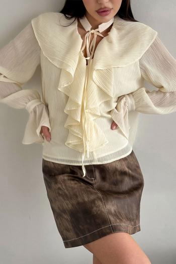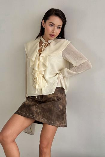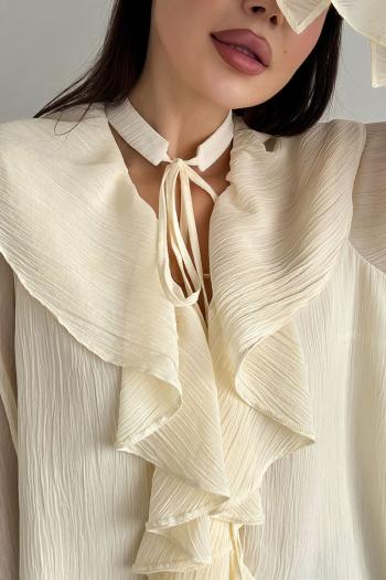 Размеры сдвоенные 42-44, 46-48. Блуза, декорированная рюшами. Воротник-чокер с завязками. Рукава с манжетами на застежку пуговицу.