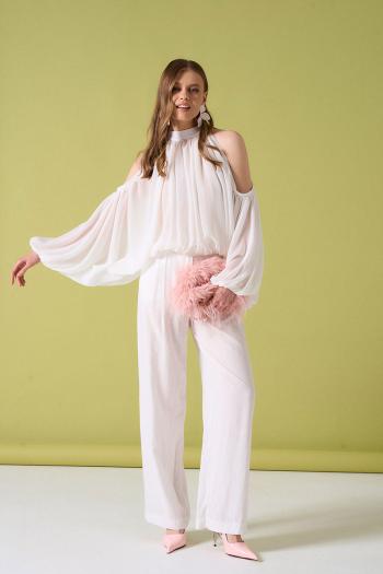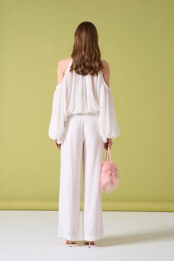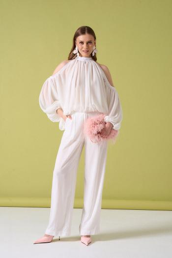 Брюки из вискозной ткани с мелкой сверкающей полоской.