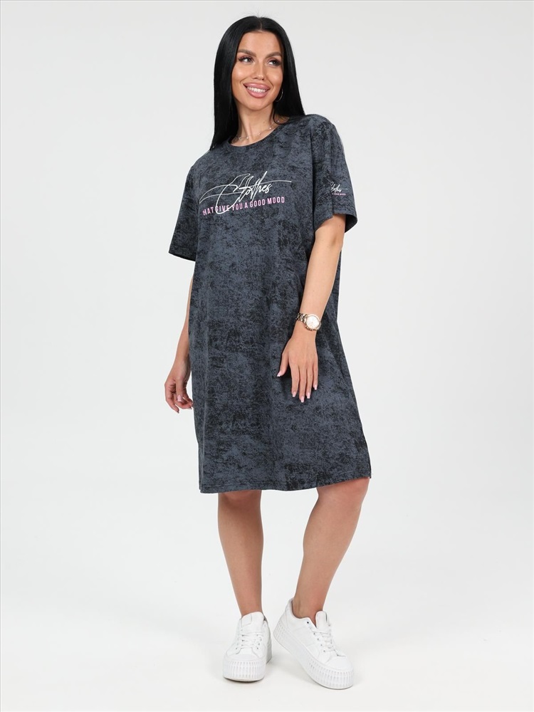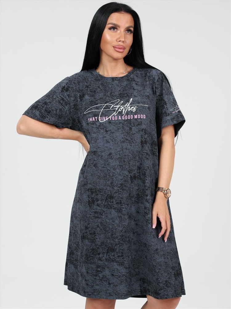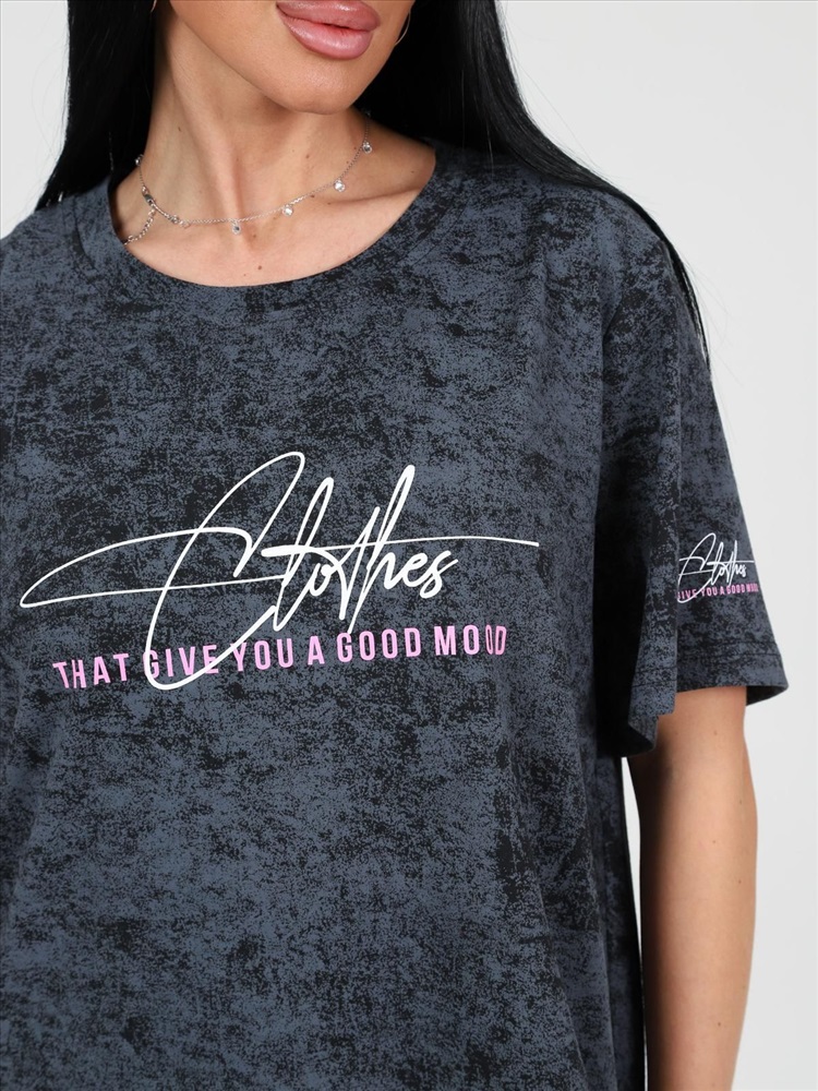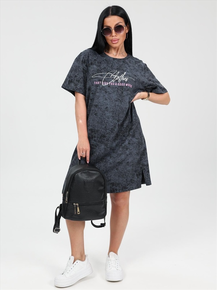 цвет: антрацитовый Материал: Кулирка Трикотаж - Кулирка (Хлопок 100%). Туника выполнена из 100% хлопка высокой плотности. Туника без карманов, горловина обработана обтачкой из основной ткани. На груди и на одном рукаве модный принт, который придает изюминку изделию. По бокам небольшие разрезы. Комментарии к товару