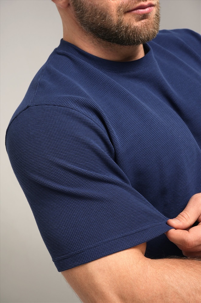 Мужская базовая футболка — идеальная основа гардероба. Вафельная футболка выглядит стильно за счёт фактурного трикотажа и отлично вписывается в кэжуал образы. Синяя футболка для мужчин сочетает комфорт, практичность и минимализм.