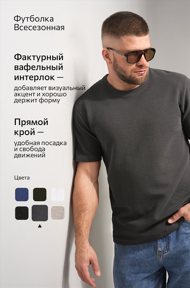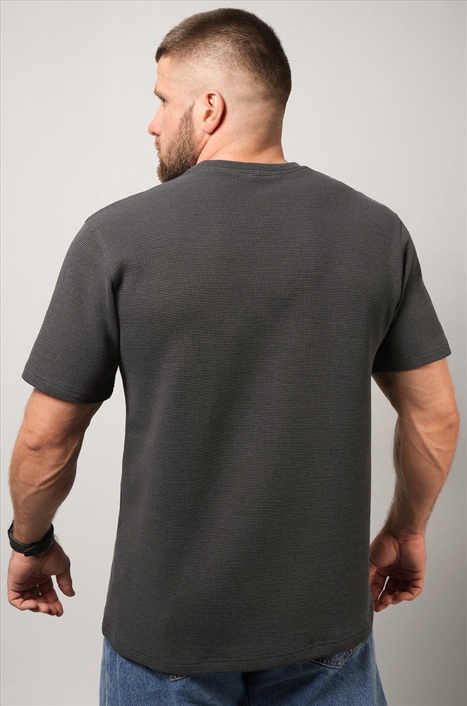 Мужская базовая футболка — идеальная основа гардероба. Вафельная футболка выглядит стильно за счёт фактурного трикотажа и отлично вписывается в кэжуал образы. Темно-серая футболка для мужчин сочетает комфорт, практичность и минимализм.