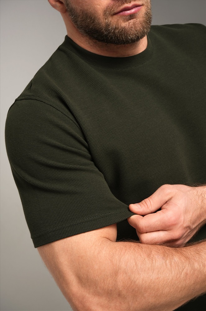 Мужская базовая футболка — идеальная основа гардероба. Вафельная футболка выглядит стильно за счёт фактурного трикотажа и отлично вписывается в кэжуал образы. Футболка цвета хаки для мужчин сочетает комфорт, практичность и минимализм.