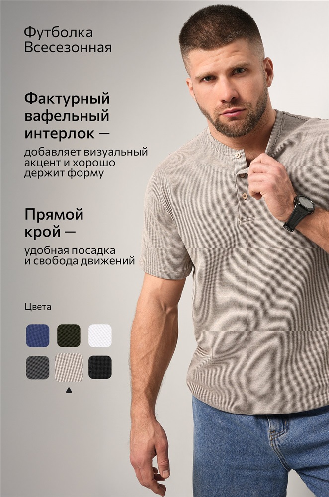 Преимущества: — плотный фактурный трикотаж из хлопка с лайкрой держит форму; — удобная планка на пуговицах без воротника для большего комфорта; — стильный вырез хенли вместо классического воротника; — вафельная ткань — практичный дышащий материал; — однотонный цвет легко сочетается с любым гардеробом. Бежевое поло для мужчин станет любимым в смарт кэжуал (Smart Casual) и спортивном стиле.