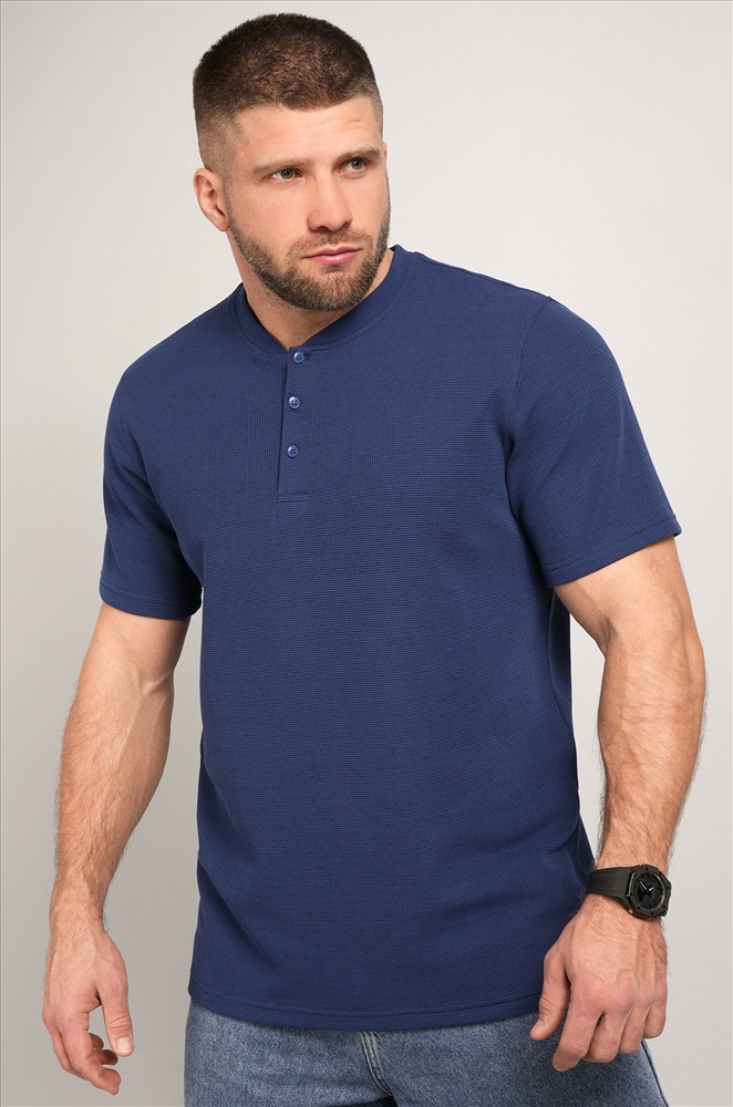 Преимущества: — плотный фактурный трикотаж из хлопка с лайкрой держит форму; — удобная планка на пуговицах без воротника для большего комфорта; — стильный вырез хенли вместо классического воротника; — вафельная ткань — практичный дышащий материал; — однотонный цвет легко сочетается с любым гардеробом. Синее поло для мужчин станет любимым в смарт кэжуал (Smart Casual) и спортивном стиле.