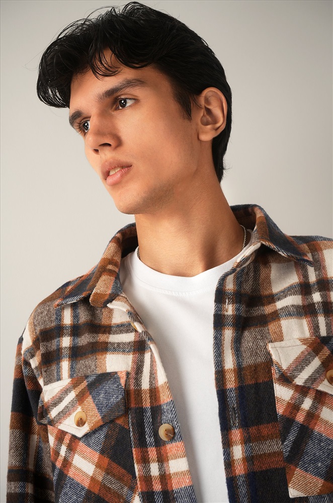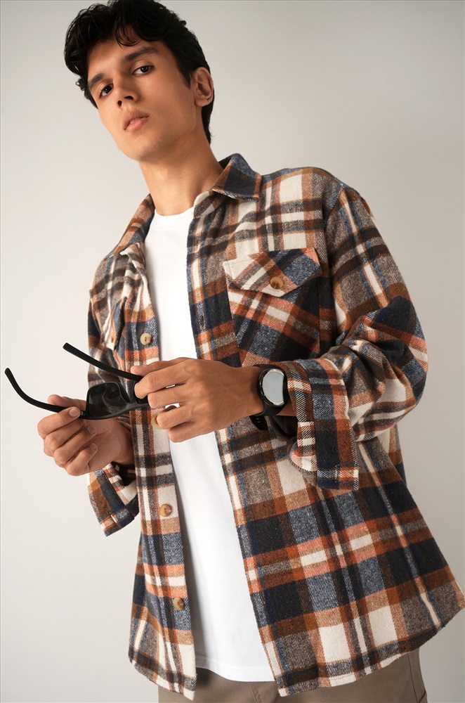 — клетчатая рубашка с длинным рукавом и отложным воротником добавляет образу харизмы;