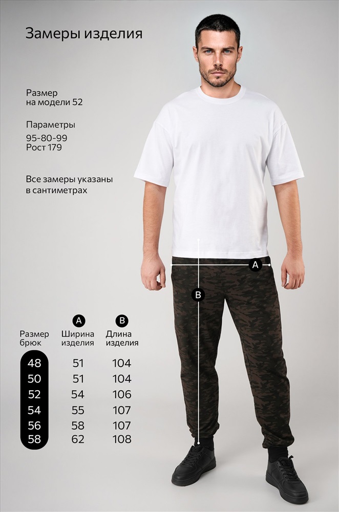 Размер 50: длина внеш.шва:100 см; длина внутр.шва:74 см; ширина по бёдрам:50 см. Размер 52: длина внеш.шва:102 см; длина внутр.шва:79 см; ширина по бёдрам:51 см. Размер 54: длина внеш.шва:103 см; длина внутр.шва:80 см; ширина по бёдрам:52 см. Размер 56: длина внеш.шва:103 см; длина внутр.шва:79 см; ширина по бёдрам:56 см. Размер 58: длина внеш.шва:105 см; длина внутр.шва:80 см; ширина по бёдрам:58 см. *замеры выборочные, могут незначительно отличаться. Комментарии к товару
