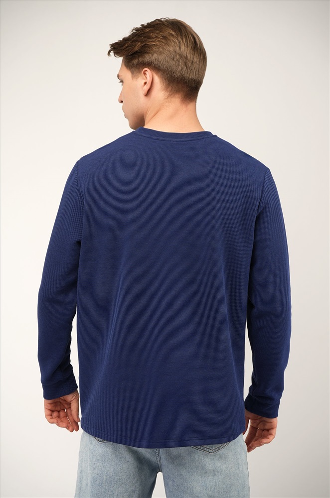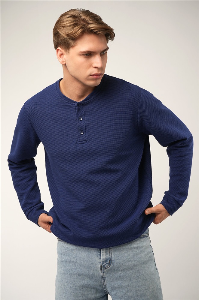 Трикотажный мужской лонгслив — твоя новая базовая классика! Стильная модель с оригинальным вырезом хенли легко заменит рубашку поло с длинным рукавом. Однотонный синий цвет и универсальный крой делают лонг идеальным для офиса и повседневных образов.