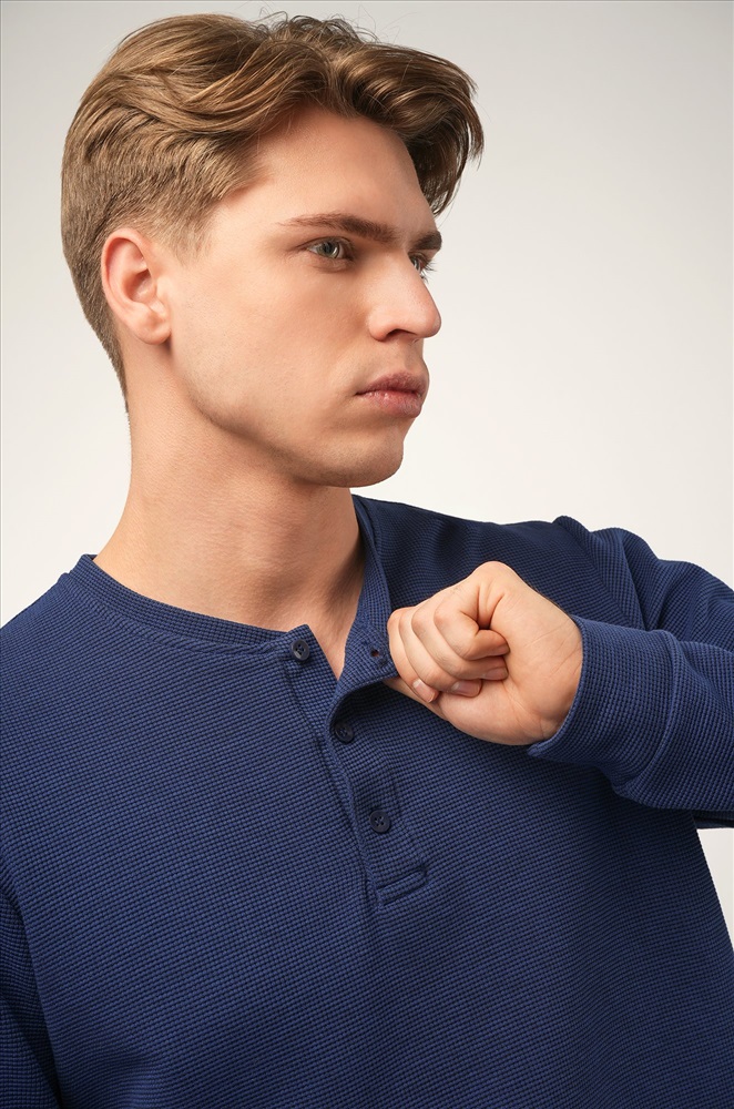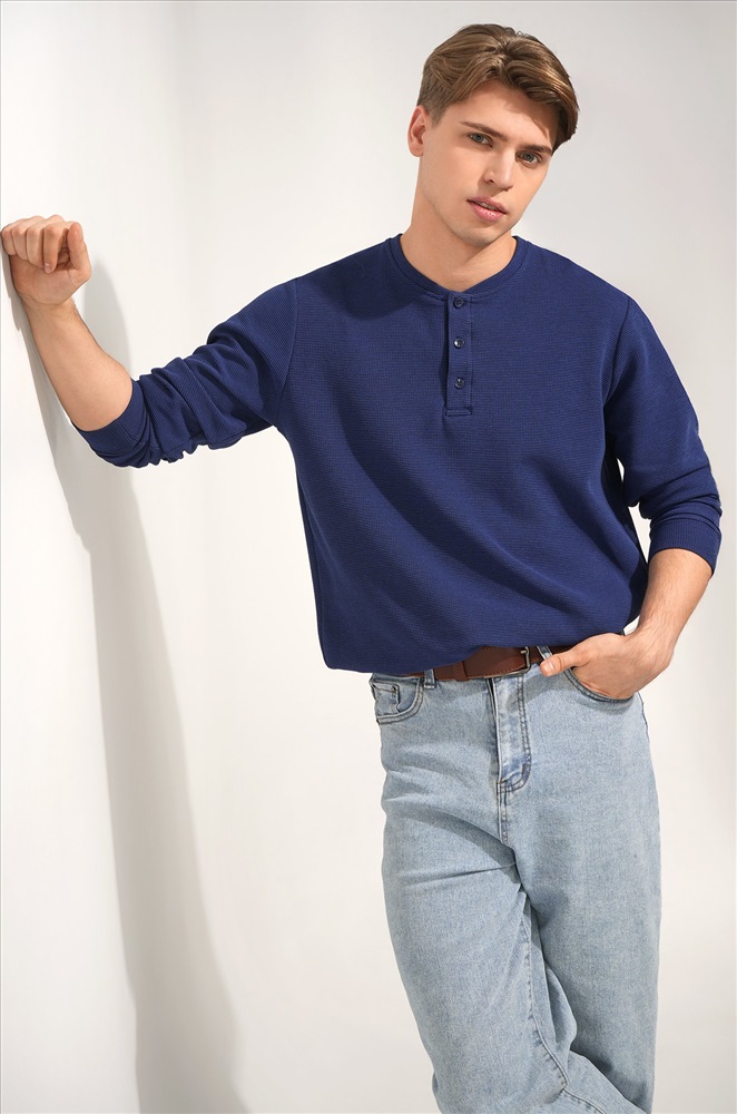 Преимущества: — плотный трикотаж из хлопка с лайкрой держит форму; — удобная планка на пуговицах без воротника для большего комфорта; — стильный вырез хенли вместо классического воротника; — вафельная ткань — практичный дышащий материал для демисезонного периода; — универсальный цвет легко сочетается с любым гардеробом. Лонгслив для мужчин станет любимым в повседневном (Smart Casual) и спортивном стиле.