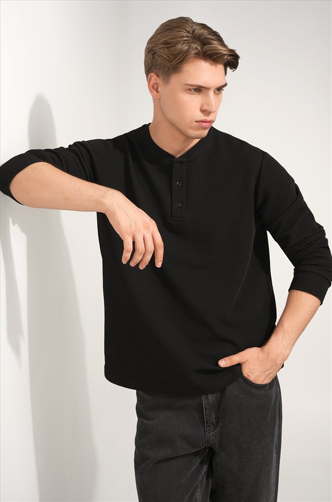 Преимущества: — плотный трикотаж из хлопка с лайкрой держит форму; — удобная планка на пуговицах без воротника для большего комфорта; — стильный вырез хенли вместо классического воротника; — вафельная ткань — практичный дышащий материал для демисезонного периода; — универсальный цвет легко сочетается с любым гардеробом. Лонгслив для мужчин станет любимым в повседневном (Smart Casual) и спортивном стиле.