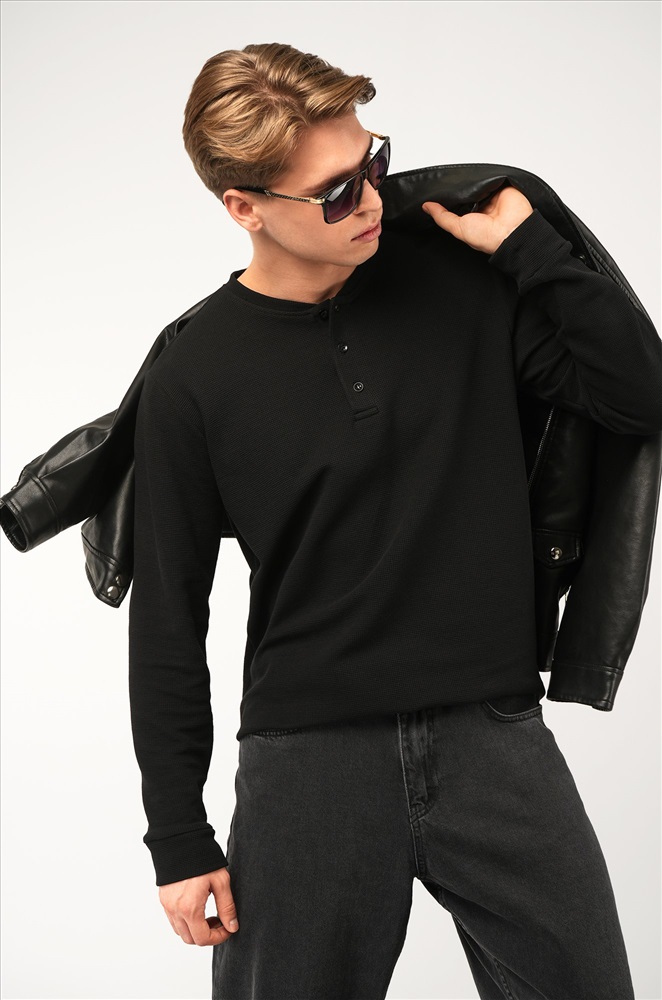 Трикотажный мужской лонгслив — твоя новая базовая классика! Стильная модель с оригинальным вырезом хенли легко заменит рубашку поло с длинным рукавом. Однотонный черный цвет и универсальный крой делают лонг идеальным для офиса и повседневных образов.