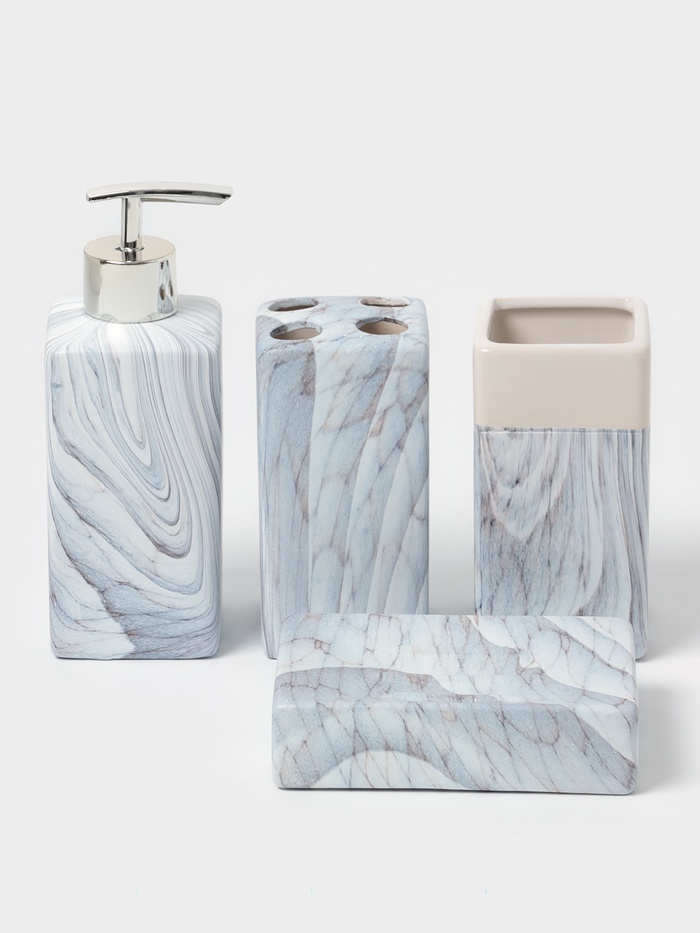 Набор аксессуаров организует пространство и станет стильным украшением Вашей ванной комнаты. За счет сдержанного дизайна данный керамический набор в ванную подойдет к любому дизайну ванной комнаты. Набор состоит из 4 предметов: 2 стакана, мыльница, дозатор.